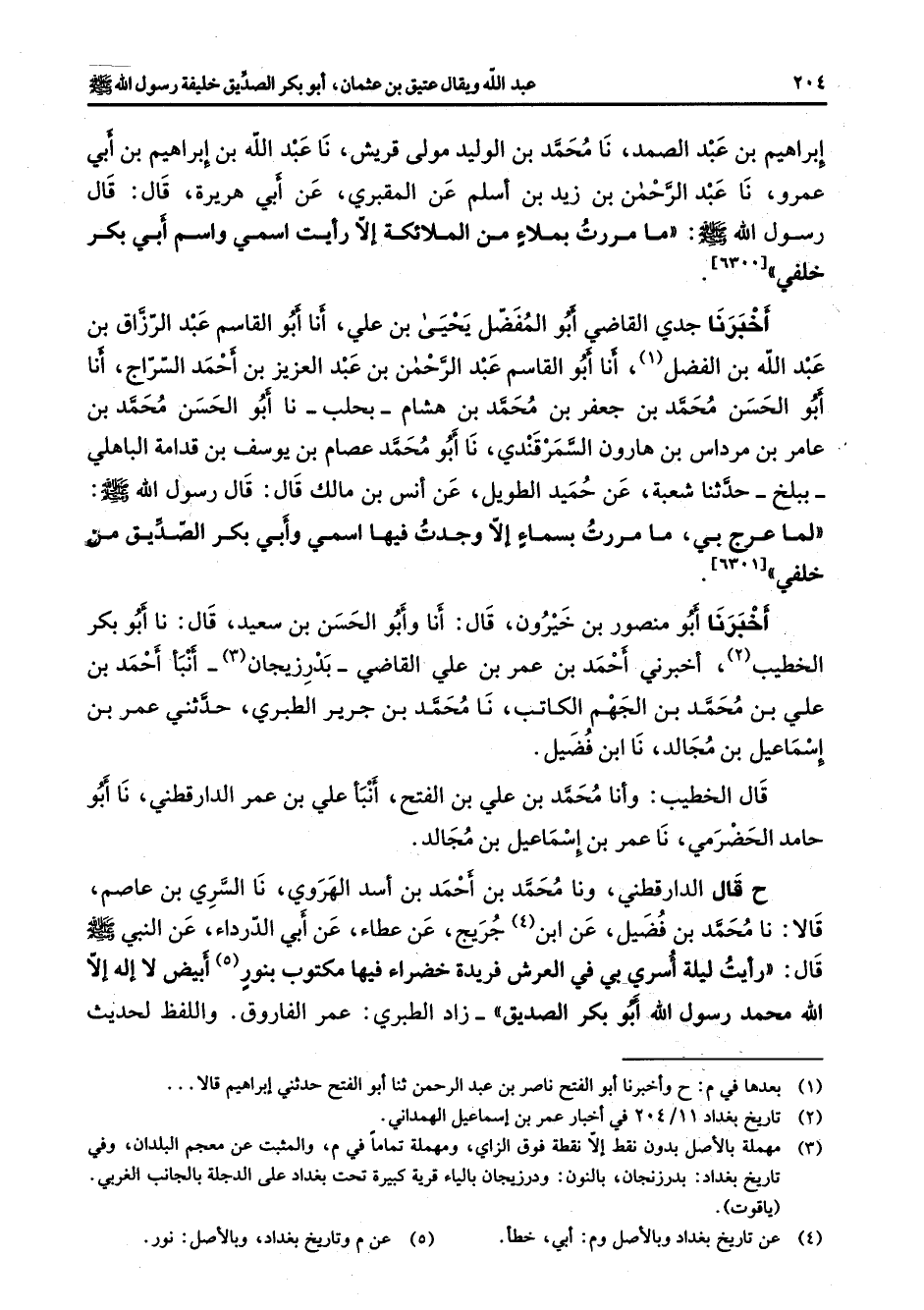 إبراهيم بن عبد الصمد نا محمد بن الوليد مولى قريش نا عبد الله بن إبراهيم بن أبي عمرو نا عبد الرحمن بن زيد بن أسلم عن المقبري عن أبي هريرة قال قال رسول الله (صلى الله عليه وسلم) ما مررت بملاء من الملائكة إلا رأيت اسمي واسم أبي بكر خلفي أخبرنا جدي القاضي أبو المفضل يحيى بن علي أنا أبو القاسم عبد الرزاق بن عبد الله بن الفضل (1) أنا أبو القاسم عبد الرحمن بن عبد العزيز بن أحمد السراج أنا أبو الحسن محمد بن جعفر بن محمد بن هشام بحلب نا أبو الحسن محمد بن عامر بن مرداس بن هارون السمرقندي نا أبو محمد عصام بن يوسف بن قدامة الباهلي ببلخ حدثنا شعبة عن حميد الطويل عن أنس بن مالك قال قال رسول الله (صلى الله عليه وسلم) لما عرج بي ما مررت بسماء إلا وجدت فيها اسمي وأبي بكر الصديق من خلفي أخبرنا أبو منصور بن خيرون قال أنا وأبو الحسن بن سعيد قال نا أبو بكر الخطيب (2) أخبرني أحمد بن عمر بن علي القاضي بدرزيجان (3) أنبأ أحمد بن علي بن محمد بن الجهم الكاتب نا محمد بن جرير الطبري حدثني عمر بن إسماعيل بن مجالد نا ابن فضيل قال الخطيب وأنا محمد بن علي بن الفتح أنبأ علي بن عمر الدارقطني نا أبو حامد الحضرمي نا عمر بن إسماعيل بن مجالد ح قال الدارقطني ونا محمد بن أحمد بن أسد الهروي نا السري بن عاصم قالا نا محمد بن فضيل عن ابن (4) جريج عن عطاء عن أبي الدرداء عن النبي (صلى الله عليه وسلم) قال رأيت ليلة أسري بي في العرش فريدة خضراء فيها مكتوب بنور (5) أبيض لا إله إلا الله محمد رسول الله أبو بكر الصديق زاد الطبري عمر الفاروق واللفظ لحديث