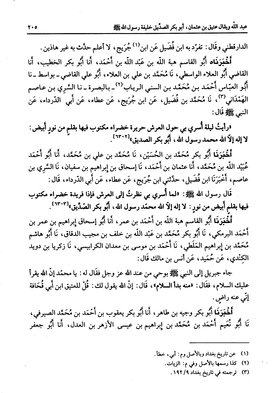 الدارقطني وقال تفرد به ابن فضيل عن ابن (1) جريج لا أعلم حدث به غير هاذين أخبرناه أبو القاسم هبة الله بن عبد الله بن أحمد أنا أبو بكر الخطيب أنا القاضي أبو العلاء الواسطي نا محمد بن علي بن العلاء أبو علي القاضي بواسط نا أبو العباس أحمد بن محمد بن السني الرياب (2) بالبصرة نا السري بن عاصم الهمداني (3) نا محمد بن فضيل عن ابن جريج عن عطاء عن أبي الدرداء عن النبي (صلى الله عليه وسلم) قال رأيت ليلة أسري بي حول العرش حريرة خضراء مكتوب فيها بقلم من نور أبيض لا إله إلا الله محمد رسول الله أبو بكر الصديق أخبرنا أبو بكر محمد بن الحسين نا محمد بن علي بن محمد أنا أبو أحمد عبيد الله بن محمد أنا عثمان بن أحمد نا إسحاق بن إبراهيم بن سفيان نا السري بن عاصم أخبرنا ابن فضيل حدثني ابن جريج عن عطاء عن أبي الدرداء قال قال رسول الله (صلى الله عليه وسلم) لما أسري بي نظرت إلى العرش فإذا فريدة خضراء مكتوب فيها بقلم أبيض من نور لا إله إلا الله محمد رسول الله أبو بكر الصديق أخبرنا أبو القاسم هبة الله بن أحمد بن عمر أنا أبو إسحاق إبراهيم بن عمر بن أحمد البرمكي نا أبو بكر محمد بن عبد الله بن خلف بن مجيب الدقاق نا أبو هاشم محمد بن إبراهيم الملطي نا أحمد بن موسى بن معدان الكرابيسي نا زكريا بن دويد الكندي عن حميد عن أنس بن مالك قال جاء جبريل إلى النبي (صلى الله عليه وسلم) بوحي من عند الله عز وجل فقال له يا محمد إن الله يقرأ عليك السلام فقال منه بدأ السلام قال إن الله يقول لك قل للعتيق ابن أبي قحافة إني عنه راض أخبرنا أبو بكر وجيه بن طاهر أنا أبو بكر يعقوب بن أحمد بن محمد الصيرفي نا أبو نعيم أحمد بن محمد بن إبراهيم بن عيسى الأزهر بن العدل أنا أبو جعفر