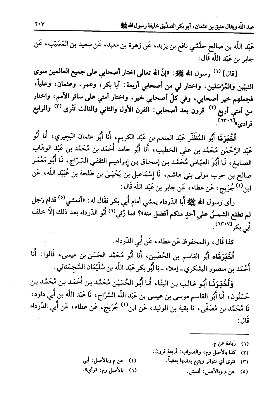 عبد الله بن صالح حدثني نافع بن يزيد عن زهرة بن معبد عن سعيد بن المسيب عن جابر بن عبد الله قال قال (1) رسول الله (صلى الله عليه وسلم) إن الله تعالى اختار أصحابي على جميع العالمين سوى النبيين والمرسلين واختار لي من أصحابي أربعة أبا بكر وعمر وعثمان وعليا فجعلهم خير أصحابي وفي كل أصحابي خير واختار أمتي على سائر الأمم واختار من أمتي أربع (2) قرون بعد أصحابي القرن الأول والثاني والثالث تترى (3) والرابع فرادى أخبرنا أبو المظفر عبد المنعم بن عبد الكريم أنا أبو عثمان البحيري أنا أبو عبد الرحمن محمد بن علي الخطيب أنا أبو حامد أحمد بن محمد بن عبد الوهاب الصايغ نا أبو العباس محمد بن إسحاق بن إبراهيم الثقفي السراج نا أبو معمر صالح بن حرب مولى بني هاشم نا إسماعيل بن يحيى بن طلحة بن عبيد الله عن ابن (4) جريج عن عطاء عن جابر بن عبد الله قال رأى رسول الله (صلى الله عليه وسلم) أبا الدرداء يمشي أمام أبي بكر فقال له أتمشي (5) قدام رجل لم تطلع الشمس على أحد منكم أفضل منه فما رئي (6) أبو الدرداء بعد ذلك إلا خلف أبي بكر كذا قال والمحفوظ عن عطاء عن أبي الدرداء أخبرناه أبو القاسم بن الحصين أنا أبو محمد الحسن بن عيسى قالوا أنا أحمد بن منصور اليشكري إملاء نا أبو بكر عبد الله بن سليمان السجستاني وأخبرنا أبو غالب بن البنا أنا أبو الحسين محمد بن أحمد بن محمد بن حسنون أنا أبو القاسم موسى بن عيسى بن عبد الله السراج نا عبد الله بن أبي داود نا محمد بن مصفى نا بقية بن الوليد عن ابن (4) جريج عن عطاء عن أبي الدرداء قال