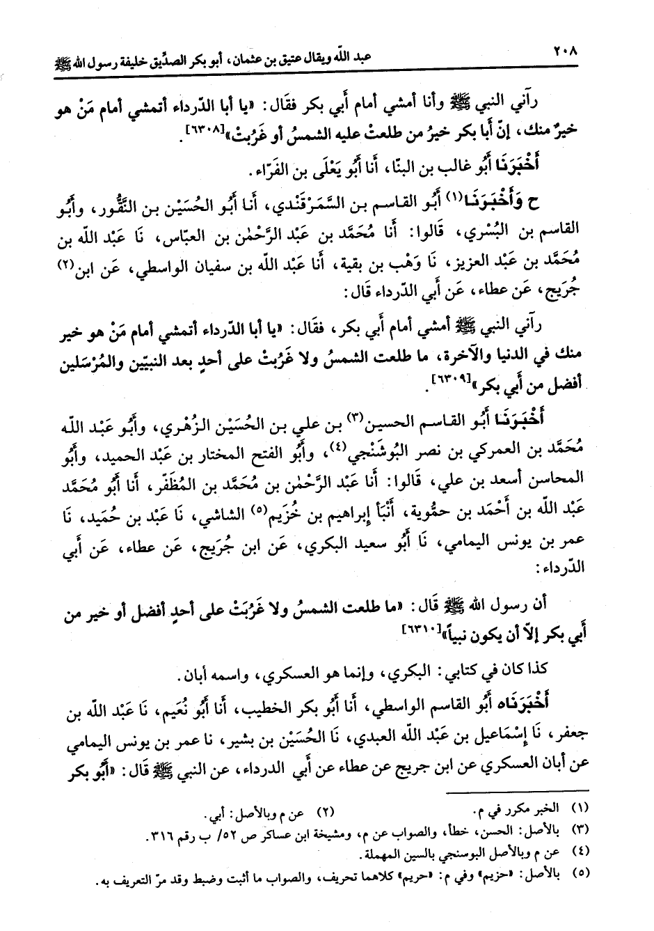 رآني النبي (صلى الله عليه وسلم) وأنا أمشي أمام أبي بكر فقال يا أبا الدرداء أتمشي أمام من هو خير منك إن أبا بكر خير من طلعت عليه الشمس أو غربت أخبرنا أبو غالب بن البنا أنا أبو يعلى بن الفراء ح وأخبرنا (1) أبو القاسم بن السمرقندي أنا أبو الحسين بن النقور وأبو القاسم بن البسري قالوا أنا محمد بن عبد الرحمن بن العباس نا عبد الله بن محمد بن عبد العزيز نا وهب بن بقية أنا عبد الله بن سفيان الواسطي عن ابن (2) جريج عن عطاء عن أبي الدرداء قال رآني النبي (صلى الله عليه وسلم) أمشي أمام أبي بكر فقال يا أبا الدرداء أتمشي أمام من هو خير منك في الدنيا والآخرة ما طلعت الشمس ولا غربت على أحد بعد النبيين والمرسلين أفضل من أبي بكر أخبرنا أبو القاسم الحسين (3) بن علي بن الحسين الزهري وأبو عبد الله محمد بن العمركي بن نصر البوشنجي (4) وأبو الفتح المختار بن عبد الحميد وأبو المحاسن أسعد بن علي قالوا أنا عبد الرحمن بن محمد بن المظفر أنا أبو محمد عبد الله بن أحمد بن حموية أنبأ إبراهيم بن خزيم (5) الشاشي نا عبد بن حميد نا عمر بن يونس اليمامي نا أبو سعيد البكري عن ابن جريج عن عطاء عن أبي الدرداء أن رسول الله (صلى الله عليه وسلم) قال ما طلعت الشمس ولا غربت على أحد أفضل أو خير من أبي بكر إلا أن يكون نبيا كذا كان في كتابي البكري وإنما هو العسكري واسمه أبان أخبرناه أبو القاسم الواسطي أنا أبو بكر الخطيب أنا أبو نعيم نا عبد الله بن جعفر نا إسماعيل بن عبد الله العبدي نا الحسين بن بشير نا عمر بن يونس اليمامي عن أبان العسكري عن ابن جريج عن عطاء عن أبي الدرداء عن النبي (صلى الله عليه وسلم) قال أبو بكر
