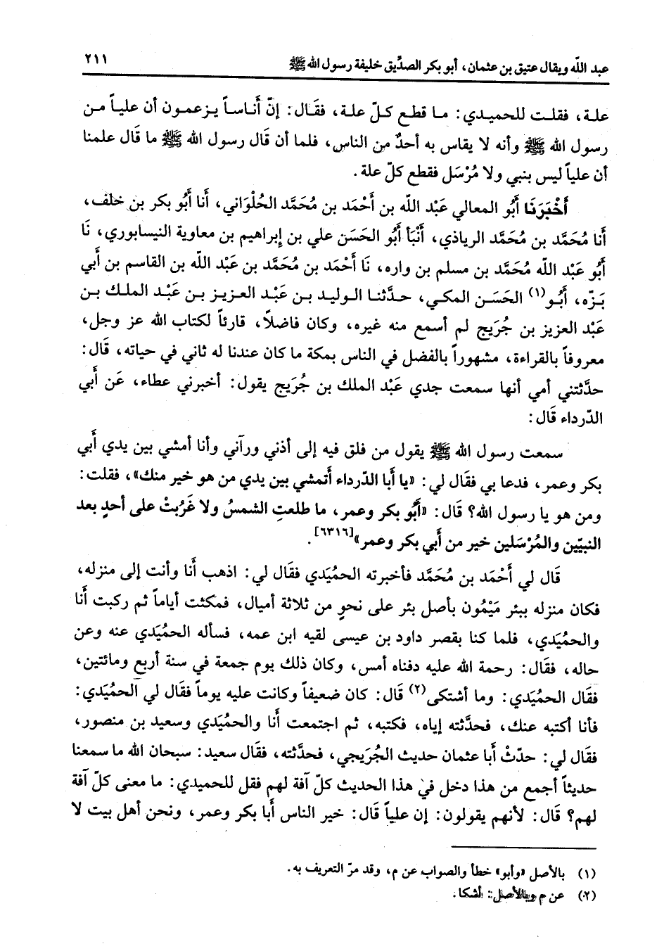 علة فقلت للحميدي ما قطع كل علة فقال إن أناسا يزعمون أن عليا من رسول الله (صلى الله عليه وسلم) وأنه لا يقاس به أحد من الناس فلما أن قال رسول الله (صلى الله عليه وسلم) ما قال علمنا أن عليا ليس بنبي ولا مرسل فقطع كل علة أخبرنا أبو المعالي عبد الله بن أحمد بن محمد الحلواني أنا أبو بكر بن خلف أنا محمد بن محمد الرياذي أنبأ أبو الحسن علي بن إبراهيم بن معاوية النيسابوري نا أبو عبد الله محمد بن مسلم بن واره نا أحمد بن محمد بن عبد الله بن القاسم بن أبي بزه أبو (1) الحسن المكي حدثنا الوليد بن عبد العزيز بن عبد الملك بن عبد العزيز بن جريج لم أسمع منه غيره وكان فاضلا قارئا لكتاب الله عز وجل معروفا بالقراءة مشهورا بالفضل في الناس بمكة ما كان عندنا له ثاني في حياته قال حدثتني أمي أنها سمعت جدي عبد الملك بن جريج يقول أخبرني عطاء عن أبي الدرداء قال سمعت رسول الله (صلى الله عليه وسلم) يقول من فلق فيه إلى أذني ورآني وأنا أمشي بين يدي أبي بكر وعمر فدعا بي فقال لي يا أبا الدرداء أتمشي بين يدي من هو خير منك فقلت ومن هو يا رسول الله قال أبو بكر وعمر ما طلعت الشمس ولا غربت على أحد بعد النبيين والمرسلين خير من أبي بكر وعمر قال لي أحمد بن محمد فأخبرته الحميدي فقال لي اذهب أنا وأنت إلى منزله فكان منزله ببئر ميمون بأصل بئر على نحو من ثلاثة أميال فمكثت أياما ثم ركبت أنا والحميدي فلما كنا بقصر داود بن عيسى لقيه ابن عمه فسأله الحميدي عنه وعن حاله فقال رحمة الله عليه دفناه أمس وكان ذلك يوم جمعة في سنة أربع ومائتين فقال الحميدي وما أشتكى (2) قال كان ضعيفا وكانت عليه يوما فقال لي الحميدي فأنا أكتبه عنك فحدثته إياه فكتبه ثم اجتمعت أنا والحميدي وسعيد بن منصور فقال لي حدث أبا عثمان حديث الجريجي فحدثته فقال سعيد سبحان الله ما سمعنا حديثا أجمع من هذا دخل في هذا الحديث كل آفة لهم فقل للحميدي ما معنى كل آفة لهم قال لأنهم يقولون إن عليا قال خير الناس أبا بكر وعمر ونحن أهل بيت لا