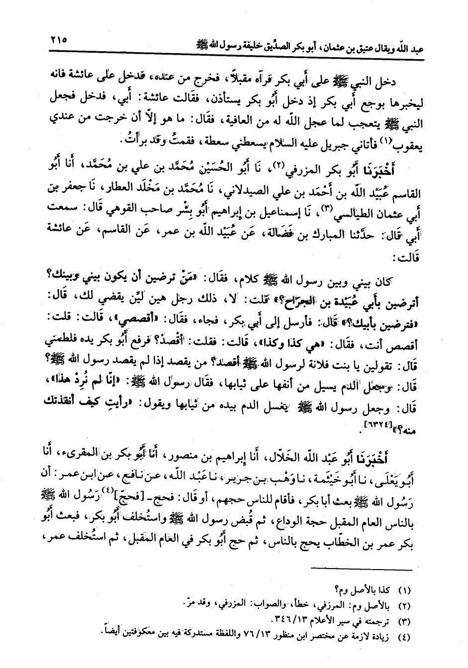 دخل النبي (صلى الله عليه وسلم) على أبي بكر فرآه مقبلا فخرج من عنده فدخل على عائشة فإنه ليخبرها بوجع أبي بكر إذا دخل أبو بكر يستأذن فقالت عائشة أبي فدخل فجعل النبي (صلى الله عليه وسلم) يتعجب لما عجل الله له من العافية فقال ما هو إلا أن خرجت من عندي يعقوب (1) فأتاني جبريل عليه السلام يسعطني سعطة فقمت وقد برأت أخبرنا أبو بكر المزرفي (2) نا أبو الحسين محمد بن علي بن محمد أنا أبو القاسم عبيد الله بن أحمد بن علي الصيدلاني نا محمد بن مخلد العطار نا جعفر بن أبي عثمان الطيالسي (3) نا إسماعيل بن إبراهيم أبو بشر صاحب القوهي قال سمعت أبي قال حدثنا المبارك بن فضالة عن عبيد الله بن عمر عن القاسم عن عائشة قالت كان بيني وبين رسول الله (صلى الله عليه وسلم) كلام فقال من ترضين أن يكون بيني وبينك أترضين بأبي عبيدة بن الجراح قلت لا ذلك رجل هين لين يقضي لك قال فترضين بأبيك قال فأرسل إلى أبي بكر فجاء فقال اقصصي قالت قلت اقصص أنت فقال هي كذا وكذا قالت فقلت أقصد فرفع أبو بكر يده فلطمني قال تقولين يا بنت فلانة لرسول الله (صلى الله عليه وسلم) أقصد من يقصد إذا لم يقصد رسول الله (صلى الله عليه وسلم) قال وجعل الدم يسيل من أنفها على ثيابها فقال رسول الله (صلى الله عليه وسلم) إنا لم نرد هذا قال وجعل رسول الله (صلى الله عليه وسلم) يغسل الدم بيده من ثيابها ويقول رأيت كيف أنقذتك منه أخبرنا أبو عبد الله الخلال أنا إبراهيم بن منصور أنا أبو بكر بن المقرئ أنا أبو يعلى نا أبو خيثمة نا وهب بن جرير نا عبد الله عن نافع عن ابن عمر أن رسول الله (صلى الله عليه وسلم) بعث أبا بكر فأقام للناس حجهم أو قال فحج فحج (4) رسول الله (صلى الله عليه وسلم) بالناس العام المقبل حجة الوداع ثم قبض رسول الله (صلى الله عليه وسلم) واستخلف أبو بكر فبعث أبو بكر عمر بن الخطاب يحج بالناس ثم حج أبو بكر في العام المقبل ثم استخلف عمر