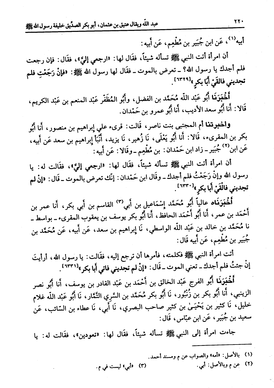 أبيه (1) عن ابن جبير بن مطعم عن أبيه أن امرأة أتت النبي (صلى الله عليه وسلم) تسأله شيئا فقال لها ارجعي إلي فقالت فإن رجعت فلم أجدك يا رسول الله تعرض بالموت فقال لها رسول الله (صلى الله عليه وسلم) فإن رجعت فلم تجديني فالقي أبا بكر