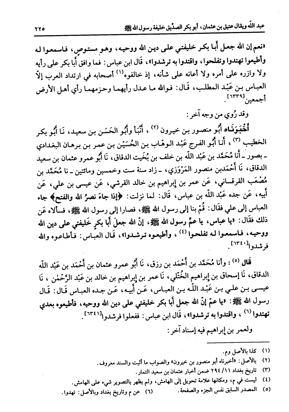 [6339] وقد روي من وجه آخر أخبرناه أبو منصور بن خيرون (2) أنبأ وأبو الحسن بن سعيد نا أبو بكر الخطيب (3) أنا أبو الفرج عبد الوهاب بن الحسين بن عمر بن برهان البغدادي بصور أنا محمد بن عبد الله بن خلف بن بخيت الدقاق نا أبو عمرو عثمان بن سعيد الدقاق نا أحمد بن منصور المروزي زاد سنة ست وخمسين ومائتين نا محمد بن مصعب القرقساني عن عمر بن إبراهيم بن خالد القرشي عن عيسى بن علي عن أبيه عن جده عبد الله بن عباس قال لما نزلت " إذا جاء نصر الله والفتح " جاء العباس إلى علي فقال قم بنا إلى رسول الله (صلى الله عليه وسلم) فصارا إلى رسول الله (صلى الله عليه وسلم) فسألاه عن ذلك فقال يا عباس يا عم رسول الله (صلى الله عليه وسلم) إن الله جعل أبا بكر خليفتي على دين الله ووحيه فاسمعوا له تفلحوا (4) وأطيعوه ترشدوا قال العباس فأطاعوه والله فرشدوا