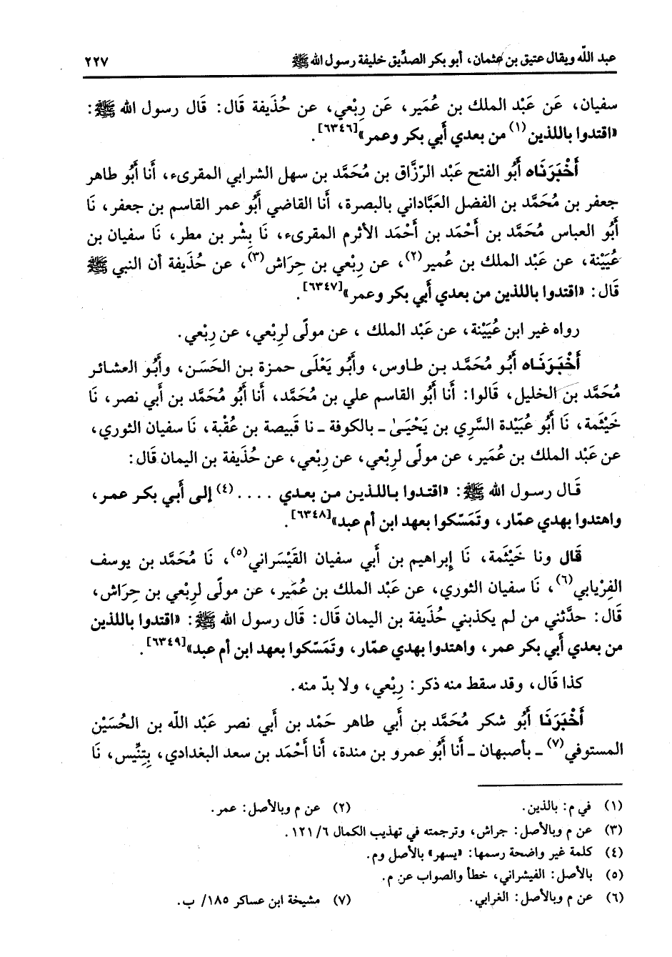 [6346] أخبرناه أبو الفتح عبد الرزاق بن محمد بن سهل الشرابي المقرئ أنا أبو طاهر جعفر بن محمد بن الفضل العباداني بالبصرة أنا القاضي أبو عمر القاسم بن جعفر نا أبو العباس محمد بن أحمد بن أحمد الأثرم المقرئ نا بشر بن مطر نا سفيان بن عيينة عن عبد الملك بن عمير عن ربعي بن حراش عن حذيفة أن النبي (صلى الله عليه وسلم) قال اقتدوا باللذين من بعدي أبي بكر وعمر