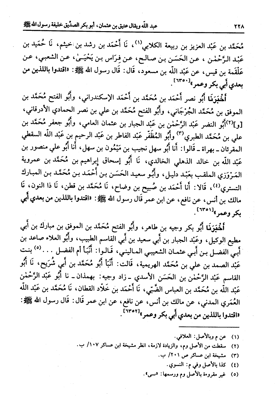 [6351] أخبرنا أبو بكر وجيه بن طاهر وأبو الفتح محمد بن الموفق بن مبارك بن أبي مطيع الوكيل وعبد الجبار بن أبي سعيد بن أبي القاسم الطبيب وأبو العلاء صاعد بن أبي الفضل بن أبي عثمان الشعيبي الماليني قالوا أنبأ أم الفضل بنت عبد الصمد بن علي بن محمد الهريمية قالت أنبأ أبو محمد بن أبي شريح نا أبو القاسم عبد الرحمن بن الحسن الأسدي زاد وجيه بهمذان نا أبو عبد الرحمن عبد الله بن محمد بن العباس الضبي نا أحمد بن خلاد القطان نا محمد بن عبد الله العمري المدني عن مالك بن أنس عن نافع عن ابن عمر قال قال رسول الله (صلى الله عليه وسلم) اقتدوا باللذين من بعدي أبي بكر وعمر