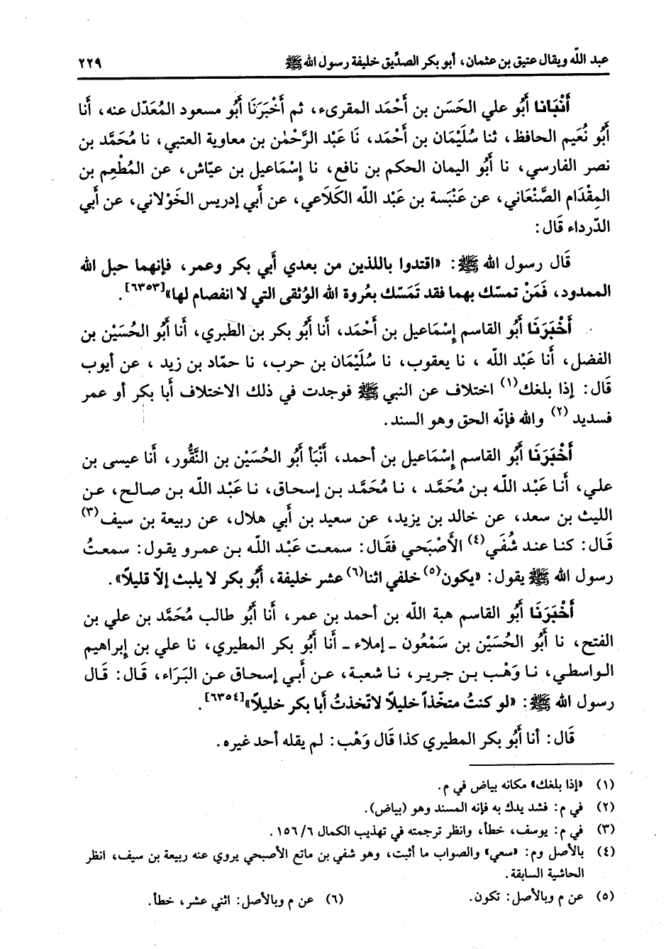 أنبأنا أبو علي الحسن بن أحمد المقرئ ثم أخبرنا أبو مسعود المعدل عنه أنا أبو نعيم الحافظ ثنا سليمان بن أحمد نا عبد الرحمن بن معاوية العتبي نا محمد بن نصر الفارسي نا أبو اليمان الحكم بن نافع نا إسماعيل بن عياش عن المطعم بن المقدام الصنعاني عن عنبسة بن عبد الله الكلاعي عن أبي إدريس الخولاني عن أبي الدرداء قال قال رسول الله (صلى الله عليه وسلم) اقتدوا باللذين من بعدي أبي بكر وعمر فإنهما حبل الله الممدود فمن تمسك بهما فقد تمسك بعروة الله الوثقي التي لا انفصام لها