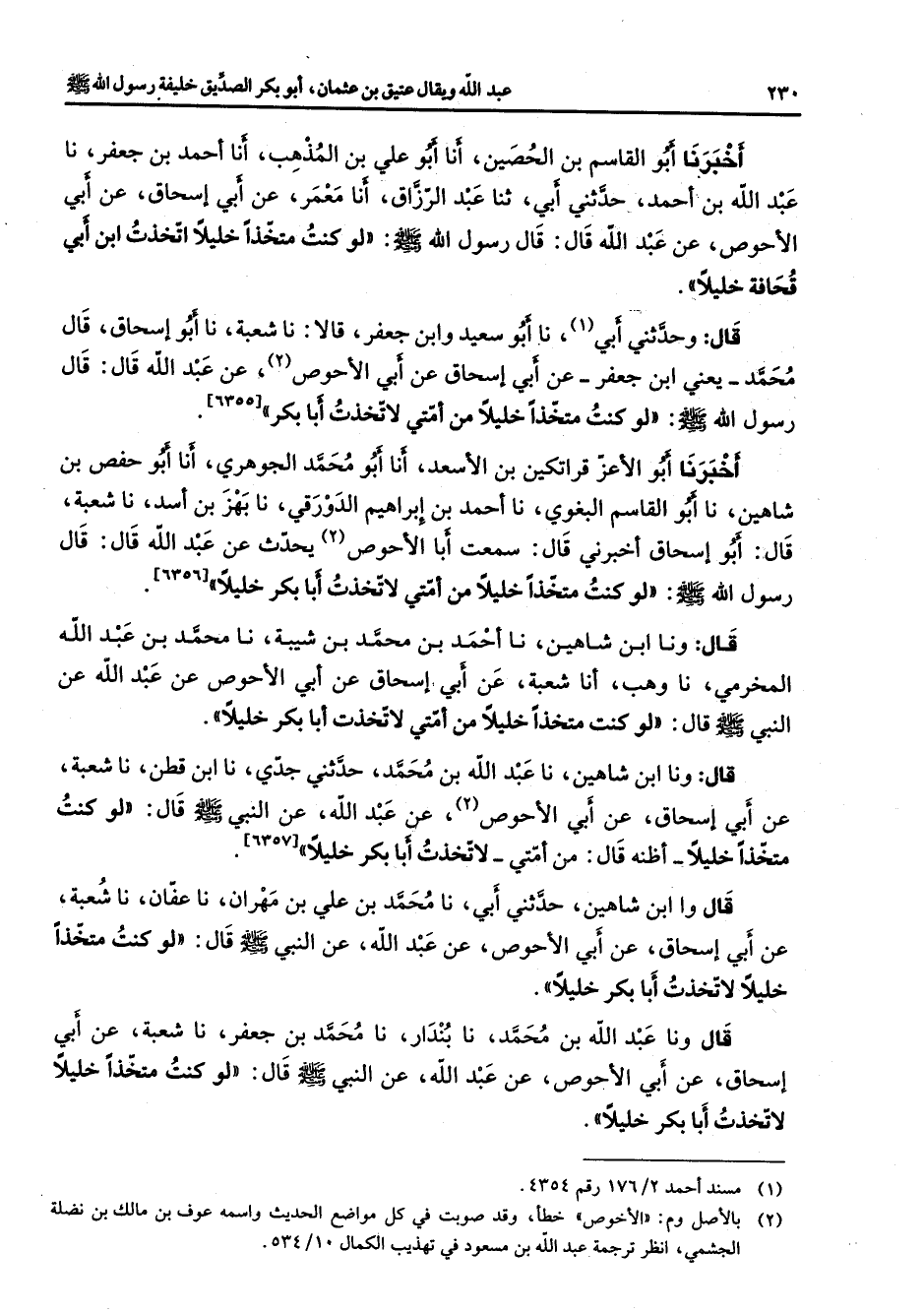 أخبرنا أبو القاسم بن الحصين أنا أبو علي بن المذهب أنا أحمد بن جعفر نا عبد الله بن أحمد حدثني أبي ثنا عبد الرزاق أنا معمر عن أبي إسحاق عن أبي الأحوص عن عبد الله قال قال رسول الله (صلى الله عليه وسلم) لو كنت متخذا خليلا اتخذت ابن أبي قحافة خليلا قال وحدثني أبي (1) نا أبو سعيد وابن جعفر قالا نا شعبة نا أبو إسحاق قال محمد يعني ابن جعفر عن أبي إسحاق عن أبي الأحوص (2) عن عبد الله قال قال رسول الله لو كنت متخذا خليلا من أمتي لاتخذت أبا بكر
