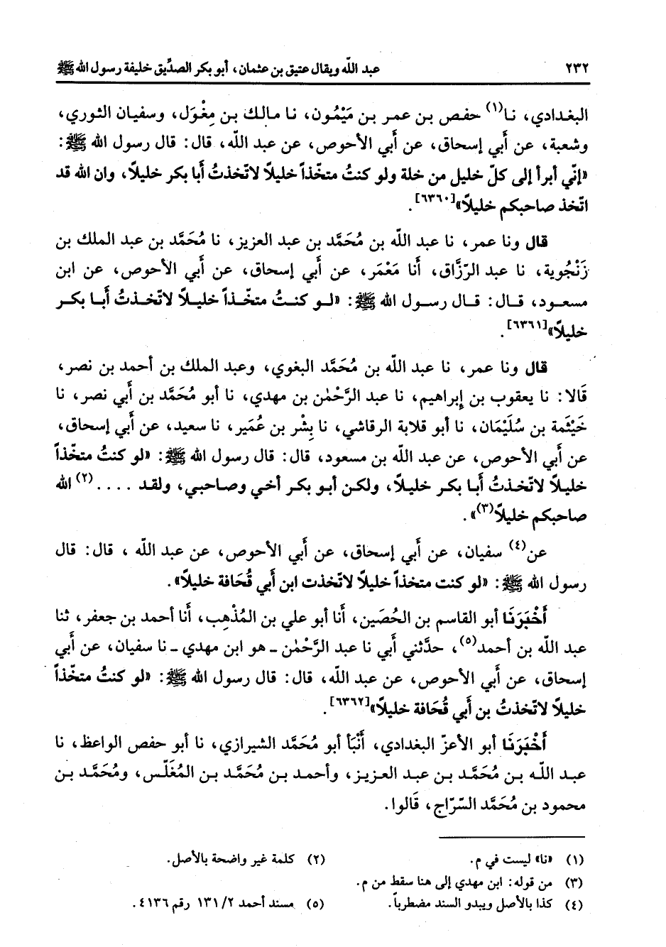 البغدادي نا (1) حفص بن عمر بن ميمون نا مالك بن مغول وسفيان الثوري وشعبة عن أبي إسحاق عن أبي الأحوص عن عبد الله قال قال رسول الله (صلى الله عليه وسلم) إني أبرأ إلى كل خليل من خلة ولو كنت متخذا خليلا لاتخذت أبا بكر خليلا وان الله قد اتخذ صاحبكم خليلا