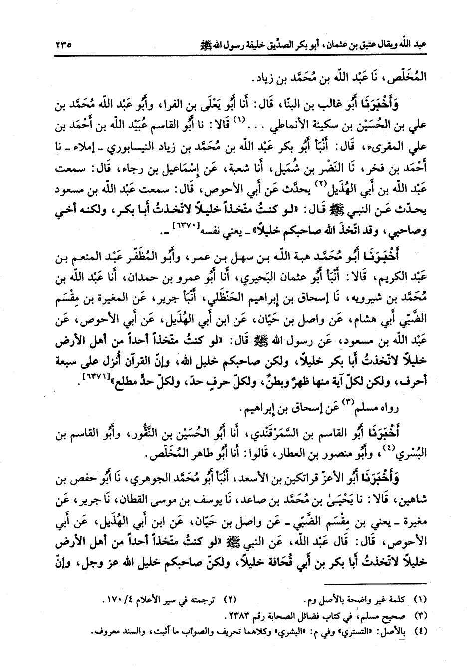 المخلص نا عبد الله بن محمد بن زياد وأخبرنا أبو غالب بن البنا قال أنا أبو يعلى بن الفراء وأبو عبد الله محمد بن علي بن الحسين بن سكينة الأنماطي (1) قالا نا أبو القاسم عبيد الله بن أحمد بن علي المقرئ قال أنبأ أبو بكر عبد الله بن محمد بن زياد النيسابوري إملاء نا أحمد بن فخر نا النضر بن شميل أنا شعبة عن إسماعيل بن رجاء قال سمعت عبد الله بن أبي الهذيل (2) يحدث عن أبي الأحوص قال سمعت عبد الله بن مسعود يحدث عن النبي (صلى الله عليه وسلم) قال لو كنت متخذا خليلا لاتخذت أبا بكر ولكنه أخي وصاحبي وقد اتخذ الله صاحبكم خليلا يعني نفسه