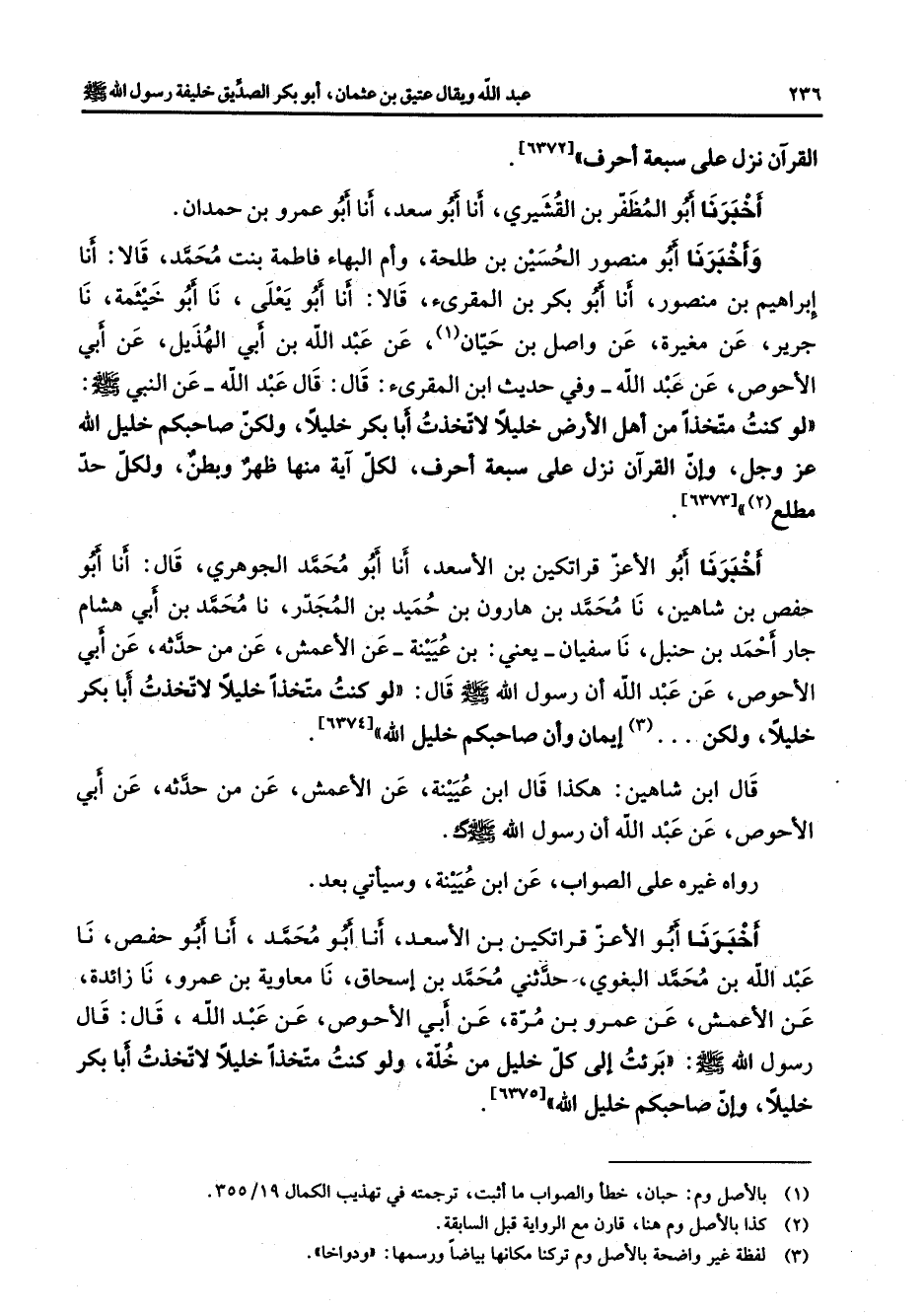 [6372] أخبرنا أبو المظفر بن القشيري أنا أبو سعد أنا أبو عمرو بن حمدان وأخبرنا أبو منصور الحسين بن طلحة وأم البهاء فاطمة بنت محمد قالا أنا إبراهيم بن منصور أنا أبو بكر بن المقرئ قالا أنا أبو يعلى نا أبو خيثمة نا جرير عن المغيرة عن واصل بن حيان (1) عن عبد الله بن أبي الهذيل عن أبي الأحوص عن عبد الله وفي حديث ابن المقرئ قال قال عبد الله عن النبي (صلى الله عليه وسلم) لو كنت متخذا من أهل الأرض خليلا لاتخذت أبا بكر خليلا ولكن صاحبكم خليل الله عز وجل وإن القرآن نزل على سبعة أحرف لكل آية منها ظهر وبطن ولكل حد مطلع (2)