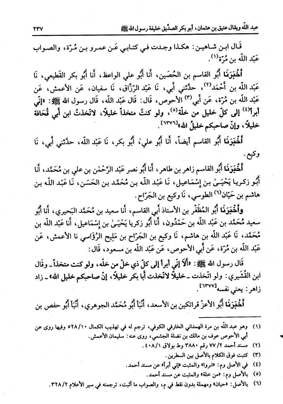 قال ابن شاهين هكذا وجدت في كتابي عن عمرو بن مرة والصواب عبد الله بن مرة (1) أخبرنا أبو القاسم بن الحصين أنا أبو علي الواعظ أنا أبو بكر القطيعي نا عبد الله بن أحمد (2) حدثني أبي نا عبد الرزاق نا سفيان عن الأعمش عن عبد الله بن مرة عن أبي (3) الأحوص قال قال عبد الله قال رسول الله (صلى الله عليه وسلم) إني أبرأ (4) إلى كل خليل من خلة (5) ولو كنت متخذا خليلا لاتخذت ابن أبي قحافة خليلا وإن صاحبكم خليل الله