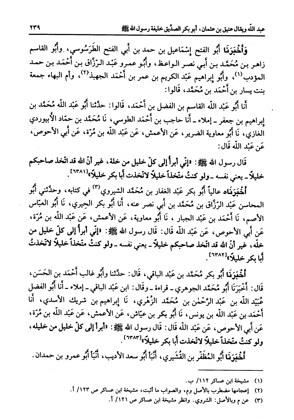 وأخبرنا أبو الفتح إسماعيل بن حمد بن أبي الفتح الطرسوسي وأبو القاسم زاهر بن محمد بن أبي نصر الواعظ وأبو عمرو عبد الرزاق بن أحمد بن حمد المؤدب (1) وأبو إبراهيم عبد الكريم بن عمر بن أحمد الجهبذ (2) وأم البهاء جمعة بنت يسار بن أحمد بن محمد قالوا أنا أبو عبد الله القاسم بن الفضل بن أحمد قالوا حدثنا أبو عبد الله محمد بن إبراهيم بن جعفر إملاء أنا حاجب بن أحمد الطوسي نا محمد بن حماد الأبيوردي الغازي نا أبو معاوية الضرير عن الأعمش عن عبد الله بن مرة عن أبي الأحوص عن عبد الله قال قال رسول الله (صلى الله عليه وسلم) إني أبرأ إلى كل خليل من خلة غير أن الله قد اتخذ صاحبكم خليلا يعني نفسه ولو كنت متخذا خليلا لاتخذت أبا بكر خليلا