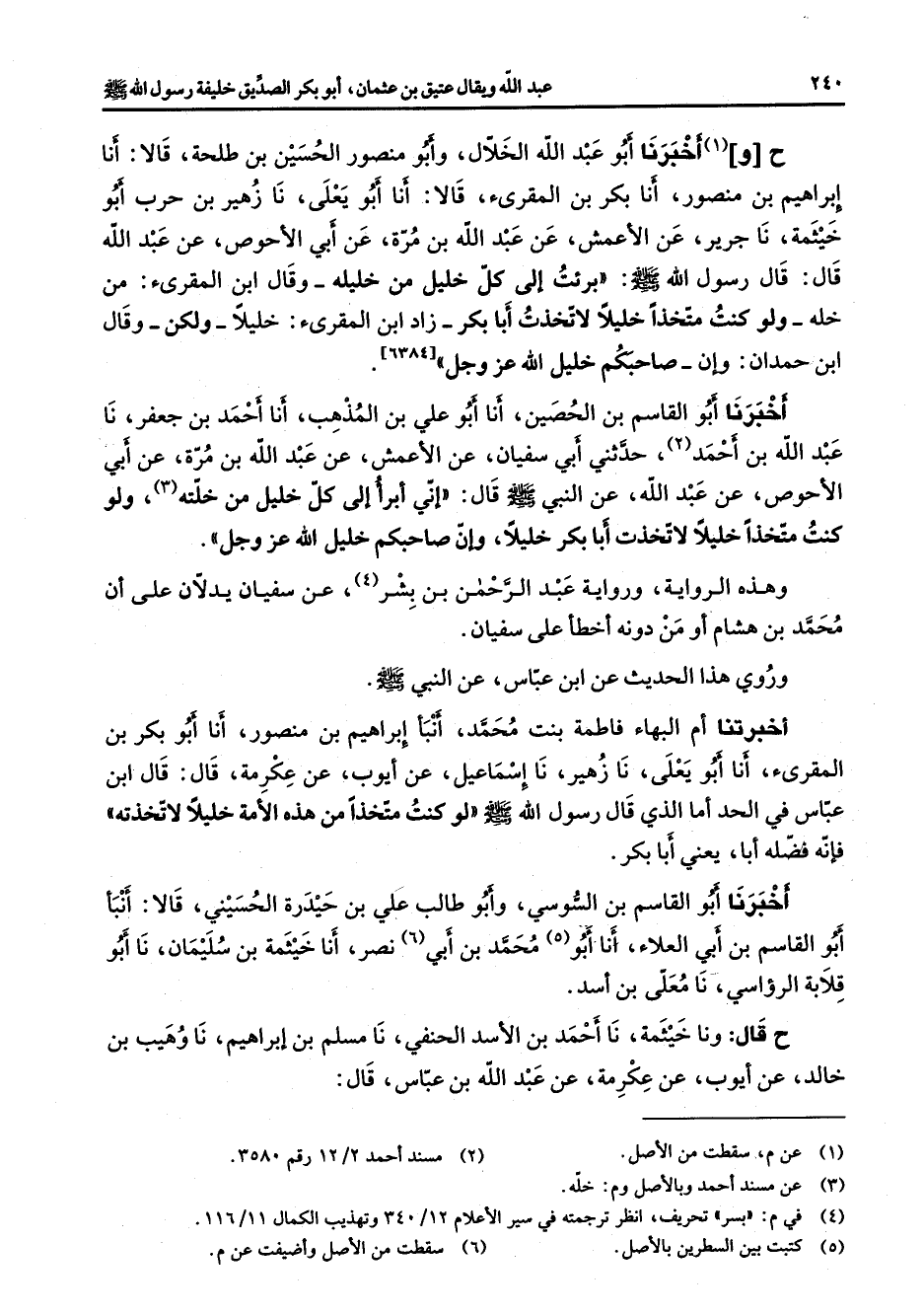 [6384] أخبرنا أبو القاسم بن الحصين أنا أبو علي بن المذهب أنا أحمد بن جعفر نا عبد الله بن أحمد (2) حدثني أبي سفيان عن الأعمش عن عبد الله بن مرة عن أبي الأحوص عن عبد الله عن النبي (صلى الله عليه وسلم) قال إني أبرأ إلى كل خليل من خلته (3) ولو كنت متخذا خليلا لاتخذت أبا بكر خليلا وإن صاحبكم خليل الله عز وجل وهذه الرواية ورواية عبد الرحمن بن بشر (4) عن سفيان يدلان على أن محمد بن هشام أو من دونه أخطأ على سفيان وروي هذا الحديث عن ابن عباس عن النبي (صلى الله عليه وسلم) أخبرتنا أم البهاء فاطمة بنت محمد أنبأ إبراهيم بن منصور أنا أبو بكر بن المقرئ أنا أبو يعلى نا زهير نا إسماعيل عن أيوب عن عكرمة قال قال ابن عباس في الحد أما الذي قال رسول الله (صلى الله عليه وسلم) لو كنت متخذا من هذه الأمة خليلا لاتخذته فإنه فضله أبا يعني أبا بكر أخبرنا أبو القاسم بن السوسي وأبو طالب علي بن حيدرة الحسيني قالا أنبأ أبو القاسم بن أبي العلاء أنا أبو (5) محمد بن أبي (6) نصر أنا خيثمة بن سليمان نا أبو قلابة الرؤاسي نا معلى بن أسد ح قال ونا خيثمة نا أحمد بن الأسد الحنفي نا مسلم بن إبراهيم نا وهيب بن خالد عن أيوب عن عكرمة عن عبد الله بن عباس قال