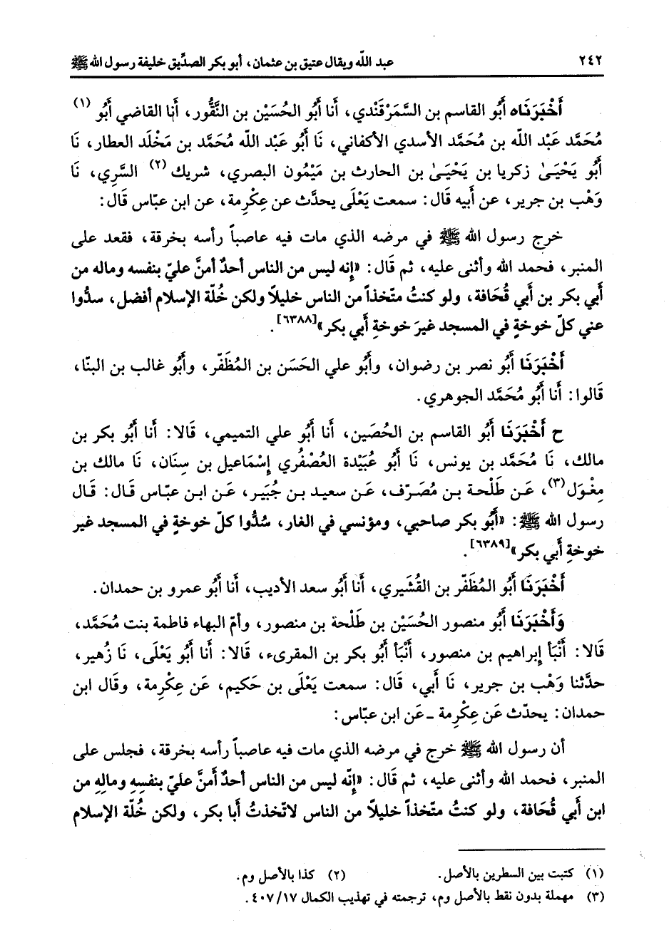 [6388] أخبرنا أبو نصر بن رضوان وابو علي الحسن بن المظفر وأبو غالب بن البنا قالوا أنا أبو محمد الجوهري ح أخبرنا أبو القاسم بن الحصين أنا أبو علي التميمي قالا أنا أبو بكر بن مالك نا محمد بن يونس نا أبو عبيدة العصفري إسماعيل بن سنان نا مالك بن مغول (3) عن طلحة بن مصرف عن سعيد بن جبير عن ابن عباس قال قال رسول الله (صلى الله عليه وسلم) أبو بكر صاحبي ومؤنسي في الغار سدوا كل خوخة في المسجد غير خوخة أبي بكر