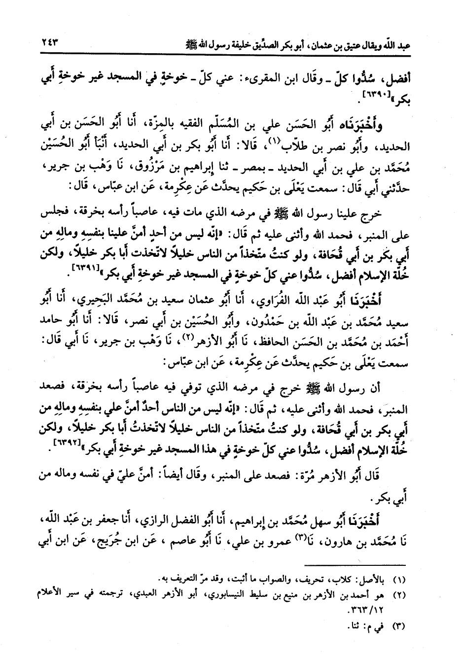 [6391] أخبرنا أبو عبد الله الفراوي أنا أبو عثمان سعيد بن محمد البحيري أنا أبو سعيد محمد بن عبد الله بن حمدون وأبو الحسين بن أبي نصر قالا أنا أبو حامد أحمد بن محمد بن الحسن الحافظ نا أبو الأزهر (2) نا وهب بن جرير نا أبي قال سمعت يعلى بن حكيم يحدث عن عكرمة عن ابن عباس أن رسول الله (صلى الله عليه وسلم) خرج في مرضه الذي توفي فيه عاصبا رأسه بخرقة فصعد المنبر فحمد الله وأثنى عليه ثم قال إنه ليس من الناس أحد أمن علي بنفسه وماله من أبي بكر بن أبي قحافة ولو كنت متخذا من الناس خليلا لاتخذت أبا بكر خليلا ولكن خلة الإسلام أفضل سدوا عني كل خوخة في هذا المسجد غير خوخة أبي بكر