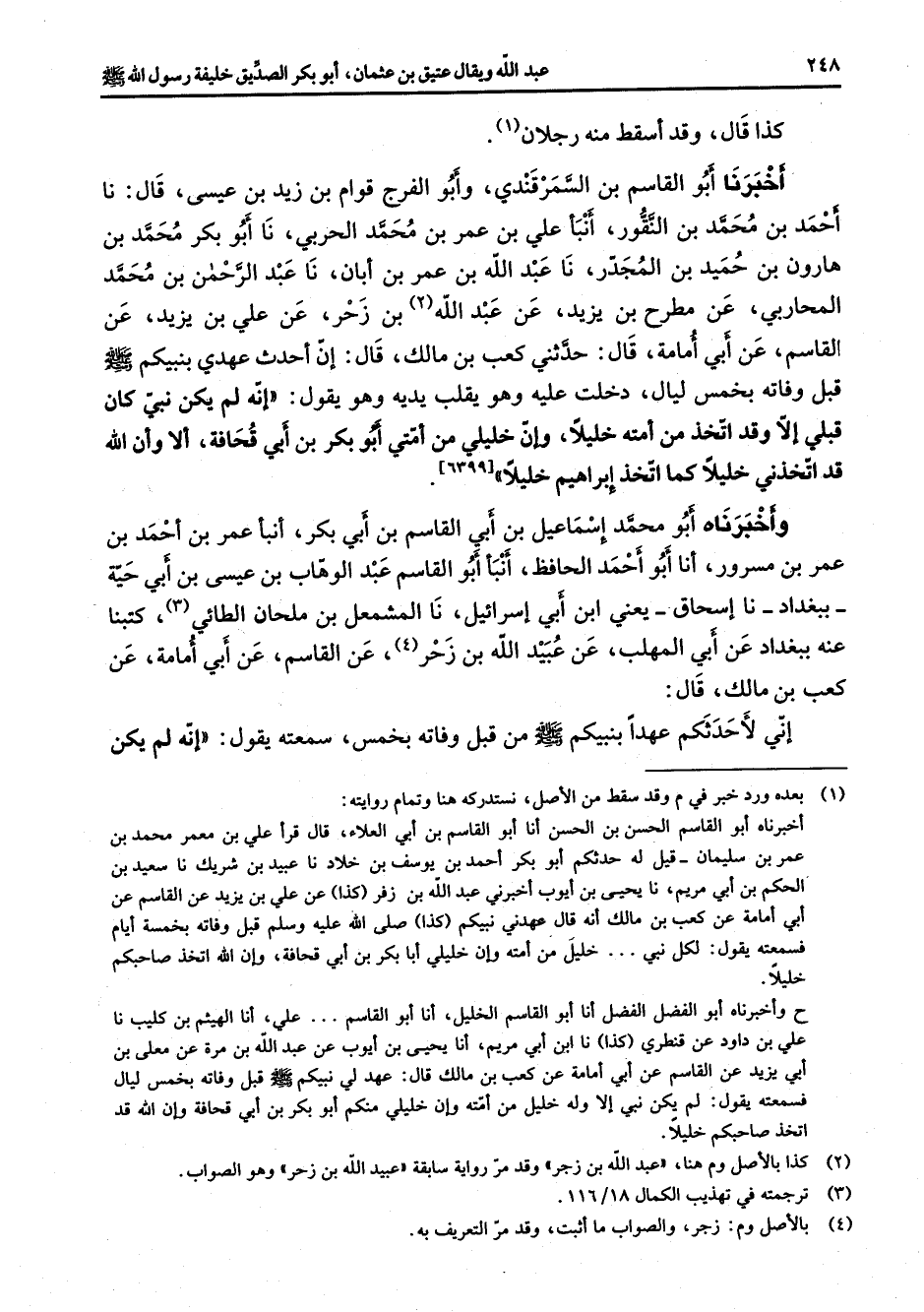 كذا قال وقد أسقط منه رجلان (1) أخبرنا أبو القاسم بن السمرقندي وأبو الفرج قوام بن زيد بن عيسى قال نا أحمد بن محمد بن النقور أنبأ علي بن عمر بن محمد الحربي نا أبو بكر محمد بن هارون بن حميد بن المجدر نا عبد الله بن عمر بن أبان نا عبد الرحمن بن محمد المحاربي عن مطرح بن يزيد عن عبد الله (2) بن زحر عن علي بن يزيد عن القاسم عن أبي أمامة قال حدثني كعب بن مالك قال إن أحدث عهدي بنبيكم (صلى الله عليه وسلم) قبل وفاته بخمس ليال دخلت عليه وهو يقلب يديه وهو يقول إنه لم يكن نبي كان قبلي إلا وقد اتخذ من أمته خليلا وإن خليلي من أمتي أبو بكر بن أبي قحافة ألا وإن الله قد اتخذني خليلا كما اتخذ إبراهيم خليلا