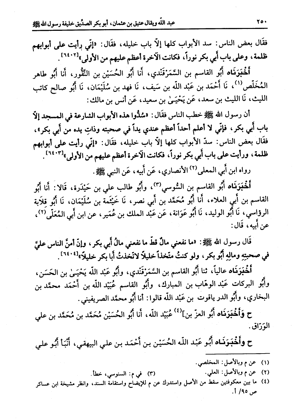 [6402] أخبرناه أبو القاسم بن السمرقندي أنا أبو الحسين بن النقور أنا أبو طاهر المخلص (1) نا أحمد بن عبد الله بن سيف نا فهد بن سليمان نا أبو صالح كاتب الليث نا الليث بن سعد عن يحيى بنسعيد عن أنس بن مالك أن رسول الله (صلى الله عليه وسلم) خطب الناس فقال سدوا هذه الأبواب الشارعة في المسجد إلا باب أبي بكر فإني لا أعلم أحدا أعظم عندي يدا في صحبته وذات يده من أبي بكر فقال بعض الناس سد الأبواب كلها إلا باب خليله فقال إني رأيت على أبوابهم ظلمة ورأيت على باب أبي بكر نورا فكانت الآخرة أعظم عليهم من الأولى