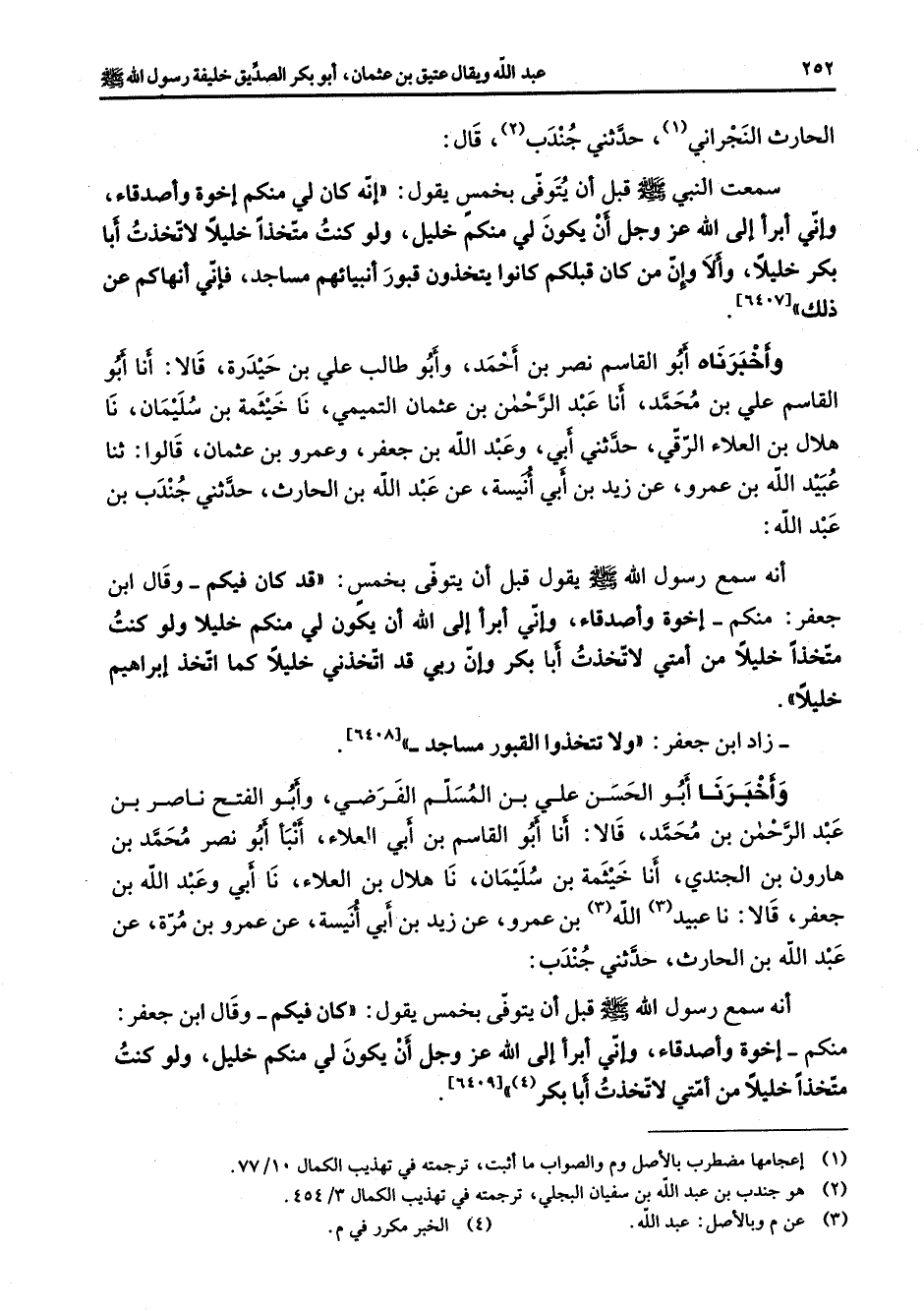 الحارث النجراني (1) حدثني جندب (2) قال سمعت النبي (صلى الله عليه وسلم) قبل أن يتوفى بخمس يقول إنه كان لي منكم إخوة وأصدقاء وإني أبرأ إلى الله عز وجل أن يكون لي منكم خليل ولو كنت متخذا خليلا لاتخذت أبا بكر خليلا وألا وإن من كان قبلكم كانوا يتخذون قبور أنبيائهم مساجد فإني أنهاكم عن ذلك