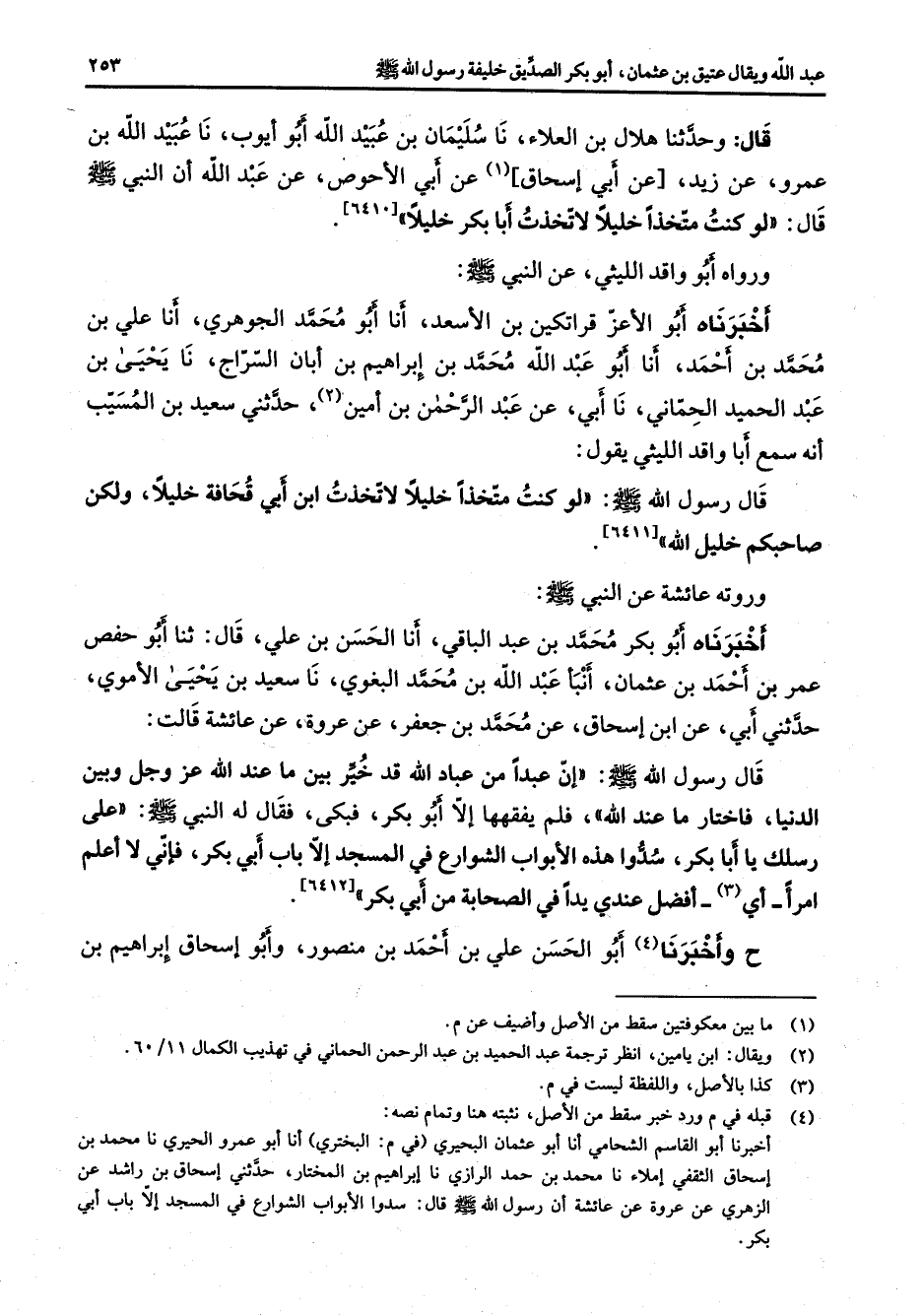 (4) قبله في م ورد خبر سقط من الأصل نثبته هنا وتمام نصه: أخبرنا أبو القاسم الشحامي أنا أبو عثمان البحيري (في م: البختري) أنا أبو عمرو الحيري نا محمد بن إسحاق الثقفي إملاء نا محمد بن حمد الرازي نا إبراهيم بن المختار حدثني إسحاق بن راشد عن الزهري عن عروة عن عائشة أن رسول الله صلى الله عليه وآله وسلم قال: سدوا الأبواب الشوارع في المسجد إلا باب أبي بكر