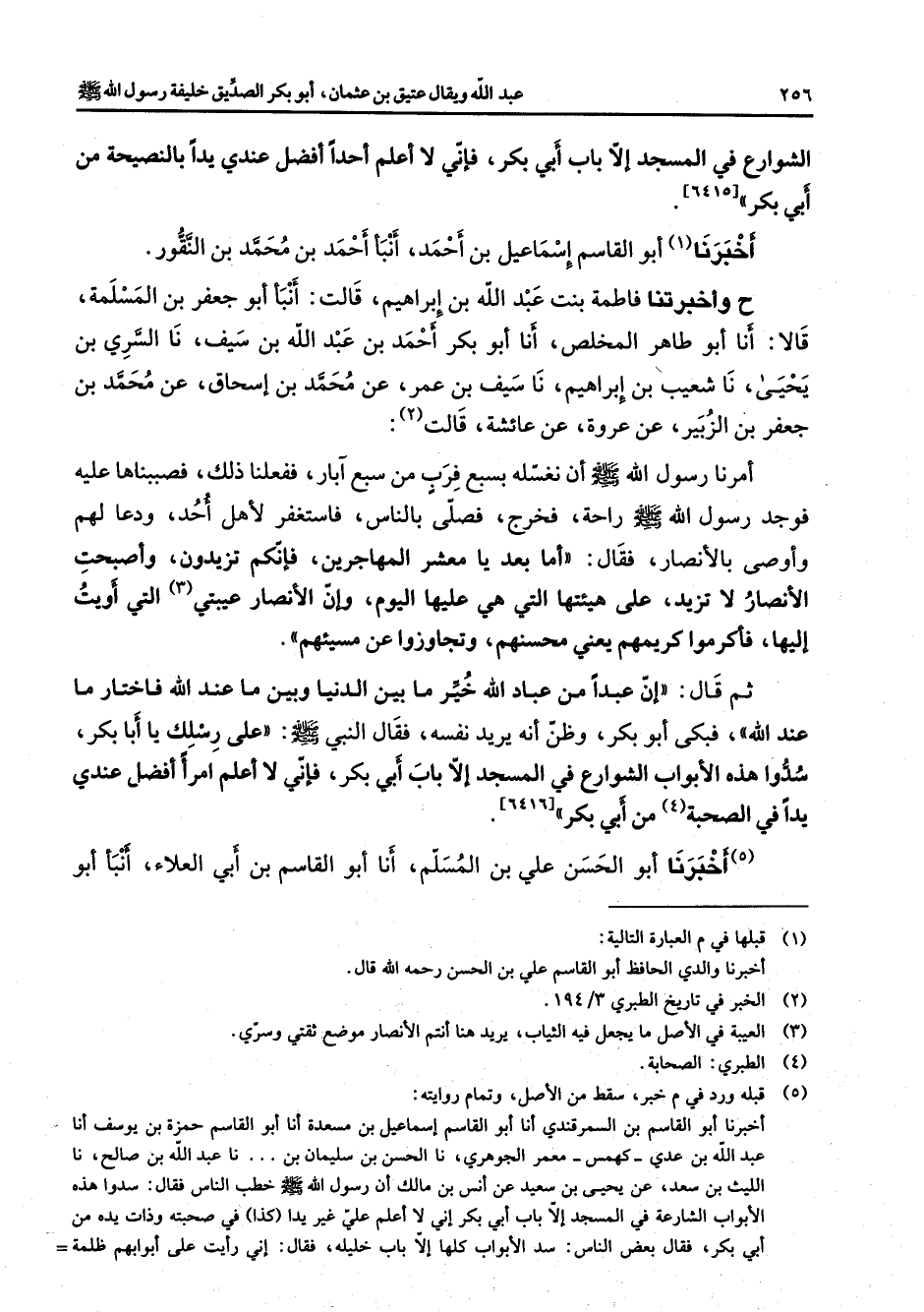 نا عبد الله بن صالح نا الليث بن سعد عن يحيى بن سعيد عن أنس بن مالك أن رسول الله صلى الله عليه وآله وسلم خطب الناس فقال: سدوا هذه الأبواب الشارعة في المسجد إلا باب أبي بكر إني لا أعلم علي غير يدا (كذا) في صحبته وذات يده من أبي بكر فقال بعض الناس: سد الأبواب كلها إلا باب خليله فقال: إني رأيت على أبوابهم ظلمة