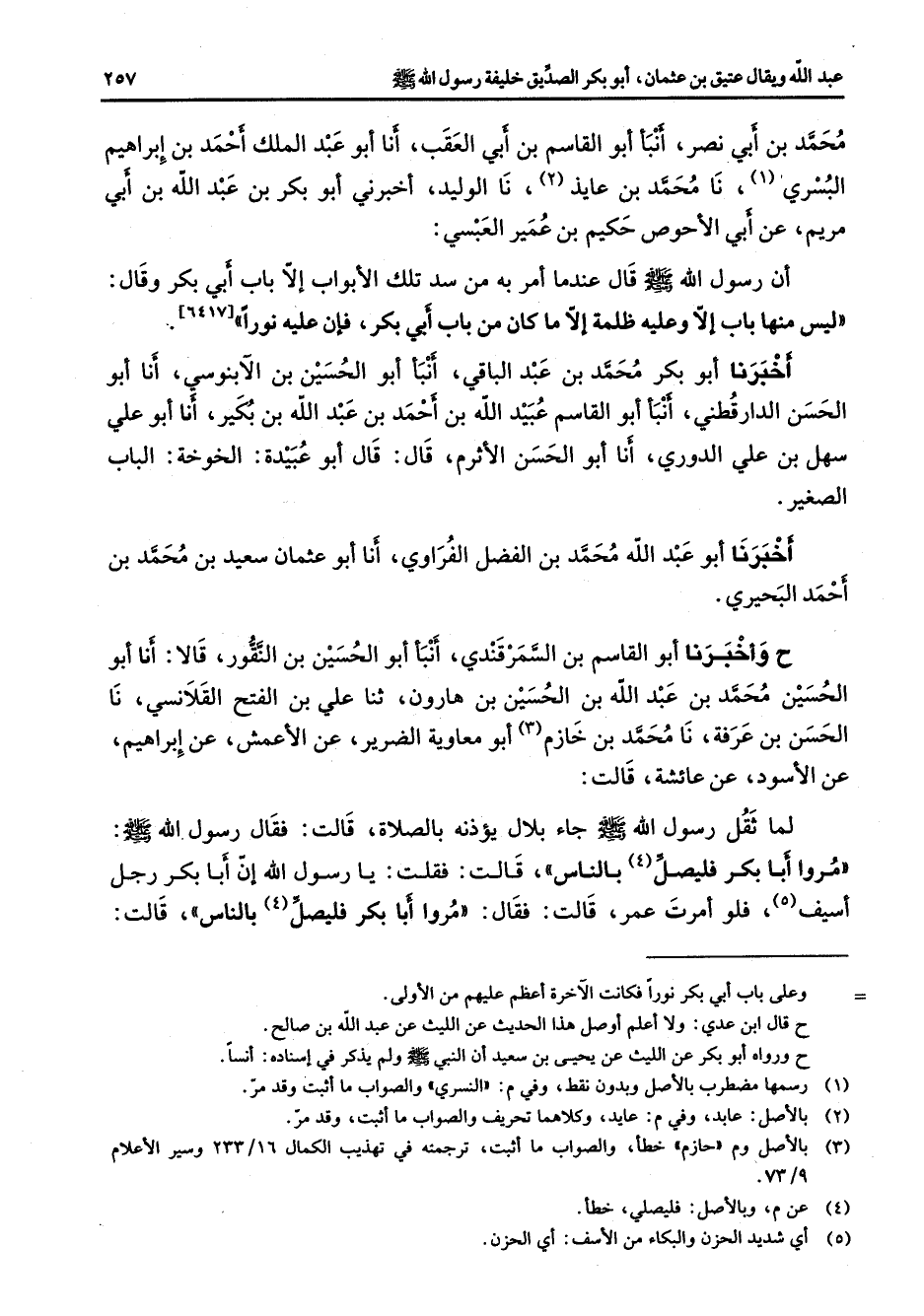 محمد بن أبي نصر أنبأ أبو القاسم بن أبي العقب أنا أبو عبد الملك أحمد بن إبراهيم البسري (1) نا محمد بن عايذ (2) نا الوليد أخبرني أبو بكر بن عبد الله بن أبي مريم عن أبي الأحوص حكيم بن عمير العبسي أن رسول الله (صلى الله عليه وسلم) قال عندما أمر به من سد تلك الأبواب إلا باب أبي بكر وقال ليس منها باب إلا وعليه ظلمة إلا ما كان من باب أبي بكر فإن عليه نورا
