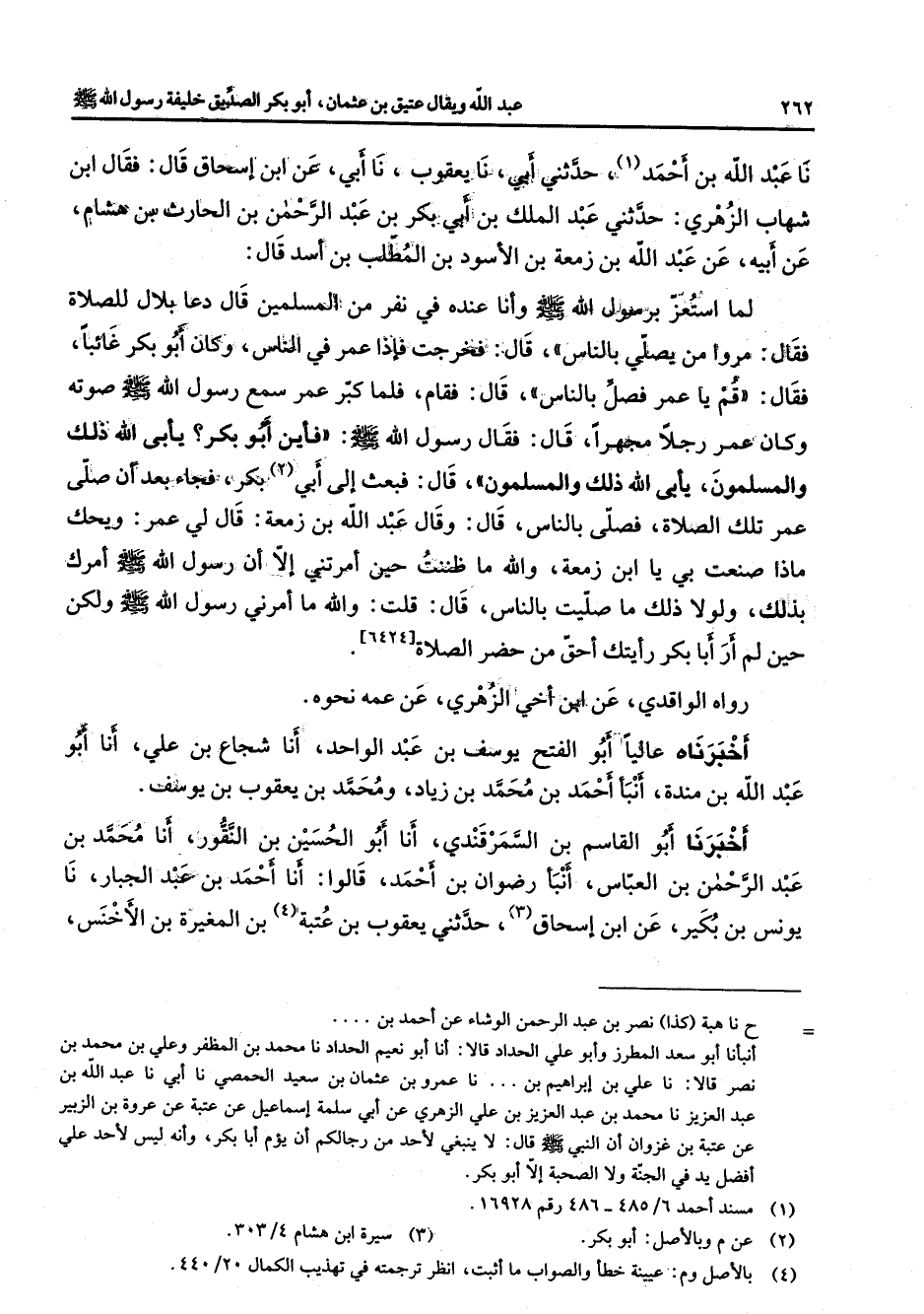 نا عبد الله بن أحمد (1) حدثني أبي نا يعقوب نا أبي عن ابن إسحاق قال فقال ابن شهاب الزهري حدثني عبد الملك بن أبي بكر بن عبد الرحمن بن الحارث بن هشام عن أبيه عن عبد الله بن زمعة بن الأسود بن المطلب بن أسد قال لما استعز برسول الله (صلى الله عليه وسلم) وأنا عنده في نفر من المسلمين قال دعا بلال للصلاة فقال مروا من يصلي بالناس قال فخرجت فإذا عمر في الناس وكان أبو بكر غائبا فقال قم يا عمر فصل بالناس قال فقام فلما كبر عمر سمع رسول الله (صلى الله عليه وسلم) صوته وكان عمر رجلا مجهرا قال فقال رسول الله (صلى الله عليه وسلم) فأين أبو بكر يأبى الله ذلك والمسلمون يأبى الله ذلك والمسلمون قال فبعث إلى أبي (2) بكر فجاء بعد أن صلى عمر تلك الصلاة فصلى بالناس قال وقال عبد الله بن زمعة قال لي عمر ويحك ماذا صنعت بي يا ابن زمعة والله ما ظننت حين أمرتني إلا أن رسول الله (صلى الله عليه وسلم) أمرك بذلك ولولا ذلك ما صليت بالناس قال قلت والله ما أمرني رسول الله (صلى الله عليه وسلم) ولكن حين لم أر أبا بكر رأيتك أحق من حضر الصلاة