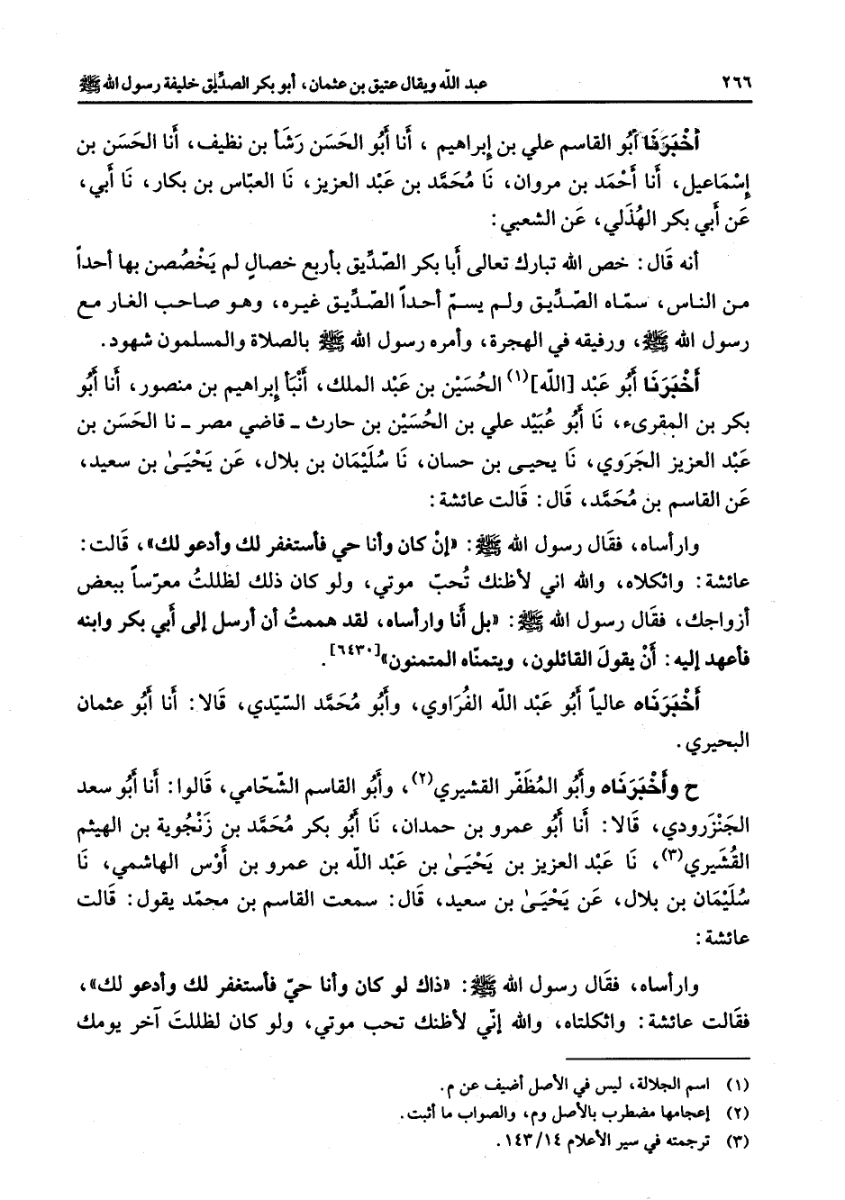 أخبرنا أبو القاسم علي بن إبراهيم أنا أبو الحسن رشأ بن نظيف أنا الحسن بن إسماعيل أنا أحمد بن مروان نا محمد بن عبد العزيز نا العباس بن بكار نا أبي عن أبي بكر الهذلي عن الشعبي أنه قال خص الله تبارك وتعالى أبا بكر الصديق بأربع خصال لم يخصصن بها أحدا من الناس سماه الصديق ولم يسم أحدا الصديق غيره وهو صاحب الغار مع رسول الله (صلى الله عليه وسلم) ورفيقه في الهجرة وأمره رسول الله (صلى الله عليه وسلم) بالصلاة والمسلمون شهود أخبرنا أبو عبد الله (1) الحسين بن عبد الملك أنبأ إبراهيم بن منصور أنا أبو بكر بن المقرئ نا أبو عبيد علي بن الحسين بن حارث قاضي مصر نا الحسن بن عبد العزيز الجروي نا يحيى بن حسان نا سليمان بن بلال عن يحيى بن سعيد عن القاسم بن محمد قال قالت عائشة وارأساه فقال رسول الله (صلى الله عليه وسلم) إن كان وأنا حي فأستغفر لك وأدعو لك قالت عائشة واثكلاه والله إني لأظنك تحب موتي ولو كان ذلك لظللت معرسا ببعض أزواجك فقال رسول الله (صلى الله عليه وسلم) بل أنا وارأساه لقد هممت أن أرسل إلى أبي بكر وابنه فأعهد إليه أن يقول القائلون ويتمناه المتمنون