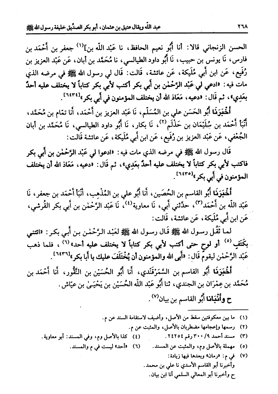 الحسن الزنجابي قالا أنا أبو نعيم الحافظ نا عبد الله بن (1) جعفر بن أحمد بن فارس نا يونس بن حبيب نا أبو داود الطيالسي نا محمد بن أبان عن عبد العزيز بن رفيع عن ابن أبي مليكة عن عائشة قالت قال لي رسول الله (صلى الله عليه وسلم) في مرضه الذي مات فيه ادعي لي عبد الرحمن بن أبي بكر أكتب لأبي بكر كتابا لا يختلف عليه أحد بعدي ثم قال دعيه معاذ الله أن يختلف المؤمنون في أبي بكر