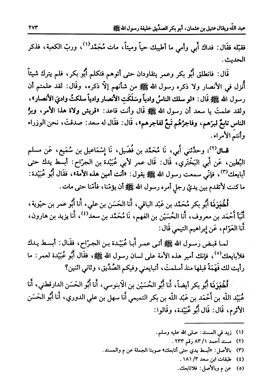 فقبله فقال فداك أبي وأمي ما أطيبك حيا وميتا مات محمد (1) ورب الكعبة فذكر الحديث قال فانطلق أبو بكر وعمر يتقاودان حتى أتوهم فتكلم أبو بكر فلم يترك شيئا أنزل في الأنصار ولا ذكره رسول الله (صلى الله عليه وسلم) من شأنهم إلا ذكره وقال لقد علمتم أن رسول الله (صلى الله عليه وسلم) قال لو سلك الناس واديا وسلكت الأنصار واديا سلكت وادي الأنصار ولقد علمت يا سعد أن رسول الله (صلى الله عليه وسلم) قال وأنت قاعد قريش ولاة هذا الأمر وبر الناس تابع لبرهم وفاجرهم تبع لفاجرهم قال فقال له سعد صدقت نحن الوزراء وأنتم الأمراء قال (2) وحدثني أبي نا محمد بن فضيل نا إسماعيل بن سميع عن مسلم البطين عن أبي البختري قال قال عمر لأبي عبيدة بن الجراح أبسط يدك حتى أبايعك (3) فإني سمعت رسول الله (صلى الله عليه وسلم) يقول أنت أمين هذه الأمة فقال أبو عبيدة ما كنت لأتقدم بين يدي رجل أمره رسول الله (صلى الله عليه وسلم) أن يؤمنا فأمنا حتى مات أخبرنا أبو بكر محمد بن عبد الباقي أنا الحسن بن علي أنا أبو عمر بن حيوية أنبأ أحمد بن معروف أنا الحسين بن الفهم نا محمد بن سعد (4) أنا يزيد بن هارون أنا العوام عن إبراهيم التيمي قال لما قبض رسول الله (صلى الله عليه وسلم) أتى عمر أبا عبيدة بن الجراح فقال أبسط يدك فلأبايعك (5) فإنك أمير هذه الأمة على لسان رسول الله (صلى الله عليه وسلم) فقال أبو عبيدة لعمر ما رأيت لك فهمة قبلها منذ أسلمت أتبايعني وفيكم الصديق وثاني اثنين أخبرنا أبو بكر أيضا أنا أبو الحسين بن الآبنوسي أنا أبو الحسن الدارقطني أنا عبيد الله بن أحمد بن عبد الله بن بكر التميمي أنا سهل بن علي الدوري أنا أبو الحسن الأثرم قال قال أبو عبيدة وقالوا