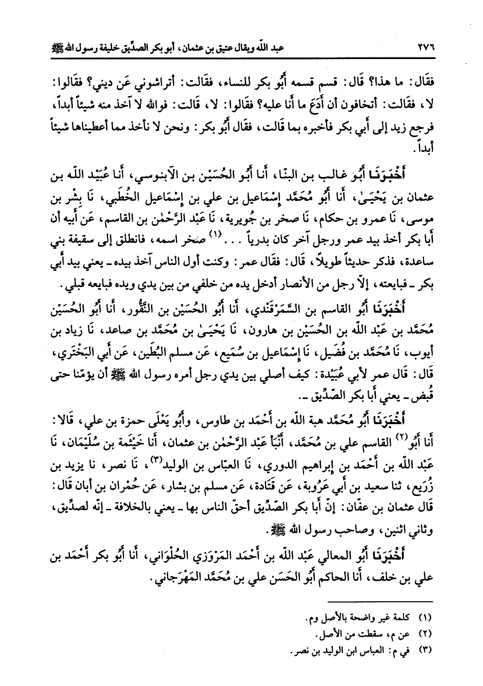 فقال ما هذا قال قسم قسمه أبو بكر للنساء فقالت أتراشوني عن ديني فقالوا لا فقالت أتخافون أن أدع ما أنا عليه فقالوا لا قالت فوالله لا آخذ منه شيئا أبدا فرجع زيد إلى أبي بكر فأخبره بما قالت فقال أبو بكر ونحن لا نأخذ مما أعطيناها شيئا أبدا أخبرنا أبو غالب بن البنا أنا أبو الحسين بن الآبنوسي أنا عبيد الله بن عثمان بن يحيى أنا أبو محمد إسماعيل بن علي بن إسماعيل الخطبي نا بشر بن موسى نا عمرو بن حكام نا صخر بن جويرية نا عبد الرحمن بن القاسم عن أبيه أن أبا بكر أخذ بيد عمر ورجل آخر كان بدريا (1) صخر اسمه فانطلق إلى سقيفة بني ساعدة فذكر حديثا طويلا قال فقال عمر وكنت أول الناس آخذ بيده يعني بيد أبي بكر فبايعته إلا رجل من الأنصار أدخل يده من خلفي من بين يدي ويده فبايعه قبلي أخبرنا أبو القاسم بن السمرقندي أنا أبو الحسين بن النقور أنا أبو الحسين محمد بن عبد الله بن الحسين بن هارون نا يحيى بن محمد بن صاعد نا زياد بن أيوب نا محمد بن فضيل نا إسماعيل بن سميع عن مسلم البطين عن أبي البختري قال قال عمر لأبي عبيدة كيف أصلي بين يدي رجل أمره رسول الله (صلى الله عليه وسلم) أن يؤمنا حتى قبض يعني أبا بكر الصديق أخبرنا أبو محمد هبة الله بن أحمد بن طاوس وأبو يعلى حمزة بن علي قالا أنا أبو (2) القاسم علي بن محمد أنبأ عبد الرحمن بن عثمان أنا خيثمة بن سليمان نا عبد الله بن أحمد بن إبراهيم الدوري نا العباس بن الوليد (3) نا نصر نا يزيد بن زريع ثنا سعيد بن أبي عروبة عن قتادة عن مسلم بن بشار عن حمران بن أبان قال قال عثمان بن عفان إن أبا بكر الصديق أحق الناس بها يعني بالخلافة إنه لصديق وثاني اثنين وصاحب رسول الله (صلى الله عليه وسلم) أخبرنا أبو المعالي عبد الله بن أحمد المروزي الحلواني أنا أبو بكر أحمد بن علي بن خلف أنا الحاكم أبو الحسن علي بن محمد المهرجاني