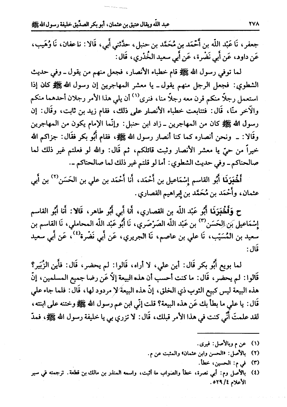 جعفر نا عبد الله بن أحمد بن محمد بن حنبل حدثني أبي قالا نا عفان نا وهيب عن داود عن أبي نضرة عن أبي سعيد الخدري قال لما توفي رسول الله (صلى الله عليه وسلم) قام خطباء الأنصار فجعل منهم من يقول وفي حديث الشطوي فجعل الرجل منهم يقول يا معشر المهاجرين إن رسول الله (صلى الله عليه وسلم) كان إذا استعمل رجلا منكم قرن معه رجلا منا فنرى (1) أن يلي هذا الأمر رجلان أحدهما منكم والآخر منا قال فتتابعت خطباء الأنصار على ذلك فقام زيد بن ثابت وقال إن رسول الله (صلى الله عليه وسلم) كان من المهاجرين زاد ابن حنبل وإنما الإمام يكون من المهاجرين وقالا ونحن أنصاره كما كنا أنصار رسول الله (صلى الله عليه وسلم) فقام أبو بكر فقال جزاكم الله خيرا من حي يا معشر الأنصار وثبت قائلكم ثم قال والله لو فعلتم غير ذلك لما صالحناكم وفي حديث الشطوي أما لو قلتم غير ذلك لما صالحناكم أخبرنا أبو القاسم إسماعيل بن أحمد أنا أحمد بن علي بن الحسن (2) بن أبي عثمان وأحمد بن محمد بن إبراهيم القصاري ح وأخبرنا أبو عبد الله بن القصاري أنا أبي أبو طاهر قالا أنا أبو القاسم إسماعيل بن الحسن (3) بن عبد الله الصرصري نا أبو عبد الله المحاملي نا القاسم بن سعيد بن المسيب نا علي بن عاصم نا الجريري عن أبي نضرة (4) عن أبي سعيد قال لما بويع أبو بكر قال أين علي لا أراه قالوا لم يحضر قال فأين الزبير قالوا لم يحضر قال ما كنت أحسب أن هذه البيعة إلا عن رضا جميع المسلمين إن هذه البيعة ليس كبيع الثوب ذي الخلق إن هذه البيعة لا مردود لها قال فلما جاء علي قال يا علي ما بطأ بك عن هذه البيعة قلت إني ابن عم رسول الله (صلى الله عليه وسلم) وختنه على ابنته لقد علمت أني كنت في هذا الأمر قبلك قال لا تزري بي يا خليفة رسول الله (صلى الله عليه وسلم) فمد