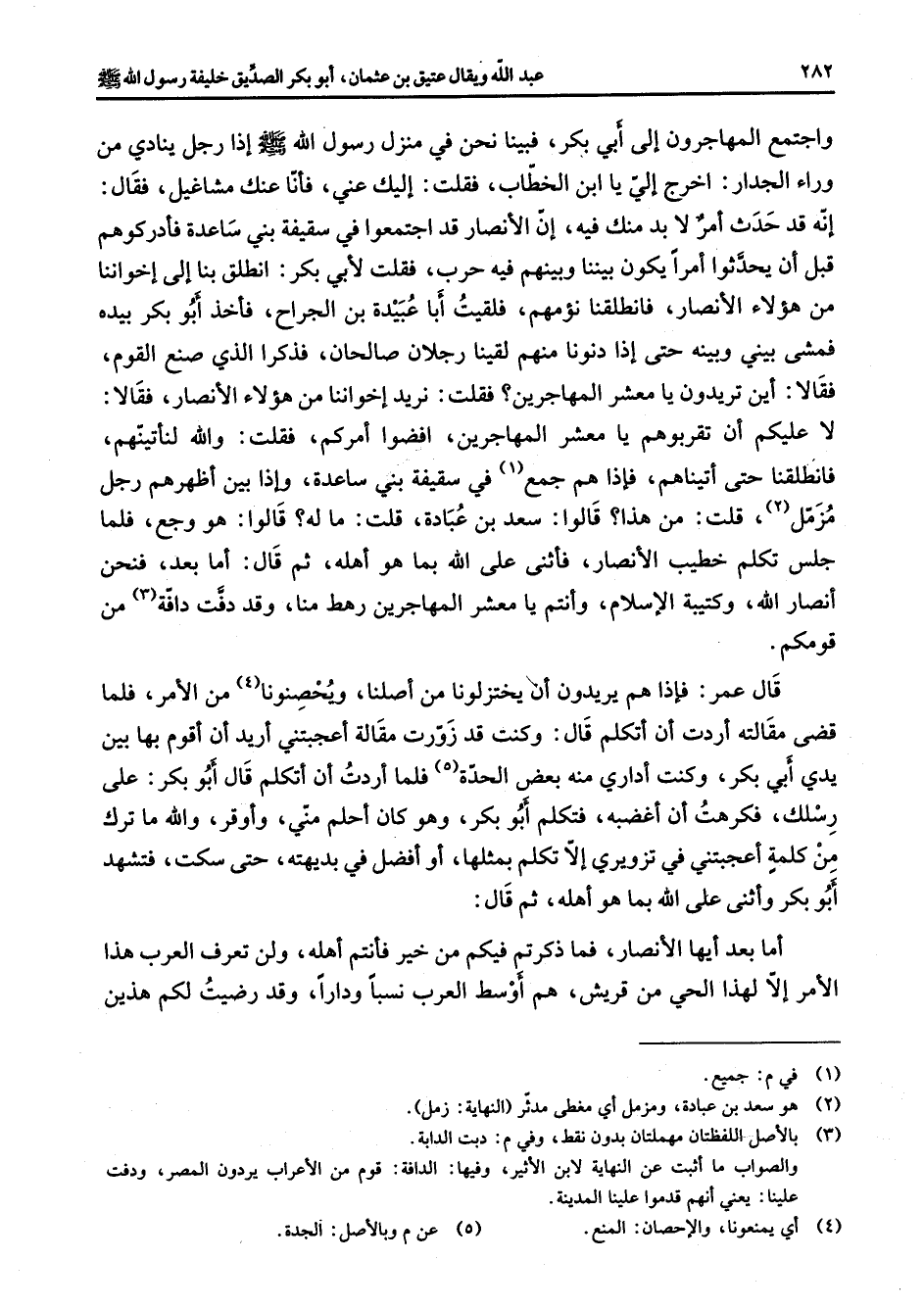 واجتمع المهاجرون إلى أبي بكر فبينا نحن في منزل رسول الله (صلى الله عليه وسلم) إذا رجل ينادي من وراء الجدار اخرج إلي يا ابن الخطاب فقلت إليك عني فأنا عنك مشاغيل فقال إنه قد حدث أمر لا بد منك فيه إن الأنصار قد اجتمعوا في سقيفة بني ساعدة فأدركوهم قبل أن يحدثوا أمرا يكون بيننا وبينهم فيه حرب فقلت لأبي بكر انطلق بنا إلى إخواننا من هؤلاء الأنصار فانطلقنا نؤمهم فلقيت أبا عبيدة بن الجراح فأخذ أبو بكر بيده فمشى بيني وبينه حتى إذا دنونا منهم لقينا رجلان صالحان فذكرا الذي صنع القوم فقالا أين تريدون يا معشر المهاجرين فقلت نريد إخواننا من هؤلاء الأنصار فقال لا عليكم أن تقربوهم يا معشر المهاجرين افضوا أمركم فقلت والله لنأتينهم فانطلقنا حتى أتيناهم فإذا هم جمع (1) في سقيفة بني ساعدة وإذا بين أظهرهم رجل مزمل (2) قلت من هذا قالوا سعد بن عبادة قلت ما له قالوا هو وجع فلما جلس تكلم خطيب الأنصار فأثنى على الله بما هو أهله ثم قال أما بعد فنحن أنصار الله وكتيبة الإسلام وأنتم يا معشر المهاجرين رهط منا وقد دفت دافة (3) من قومكم قال عمر فإذا هم يريدون أن يختزلونا من أصلنا ويحصنونا (4) من الأمر فلما قضى مقالته أردت أن أتكلم قال وكنت قد زورت مقالة أعجبتني أريد أن أقوم بها بين يدي أبي بكر وكنت أداري منه بعض الحدة (5) فلما أردت أن أتكلم قال أبو بكر على رسلك فكرهت أن أغضبه فتكلم أبو بكر وهو كان أحلم مني وأوقر والله ما ترك من كلمة أعجبتني في تزويري إلا تكلم بمثلها أو أفضل في بديهته حتى سكت فتشهد أبو بكر وأثنى على الله بما هو أهله ثم قال أما بعد أيها الأنصار فما ذكرتم فيكم من خير فأنتم أهله ولن تعرف العرب هذا الأمر إلا لهذا الحي من قريش هم أوسط العرب نسبا ودارا وقد رضيت لكم هذين
