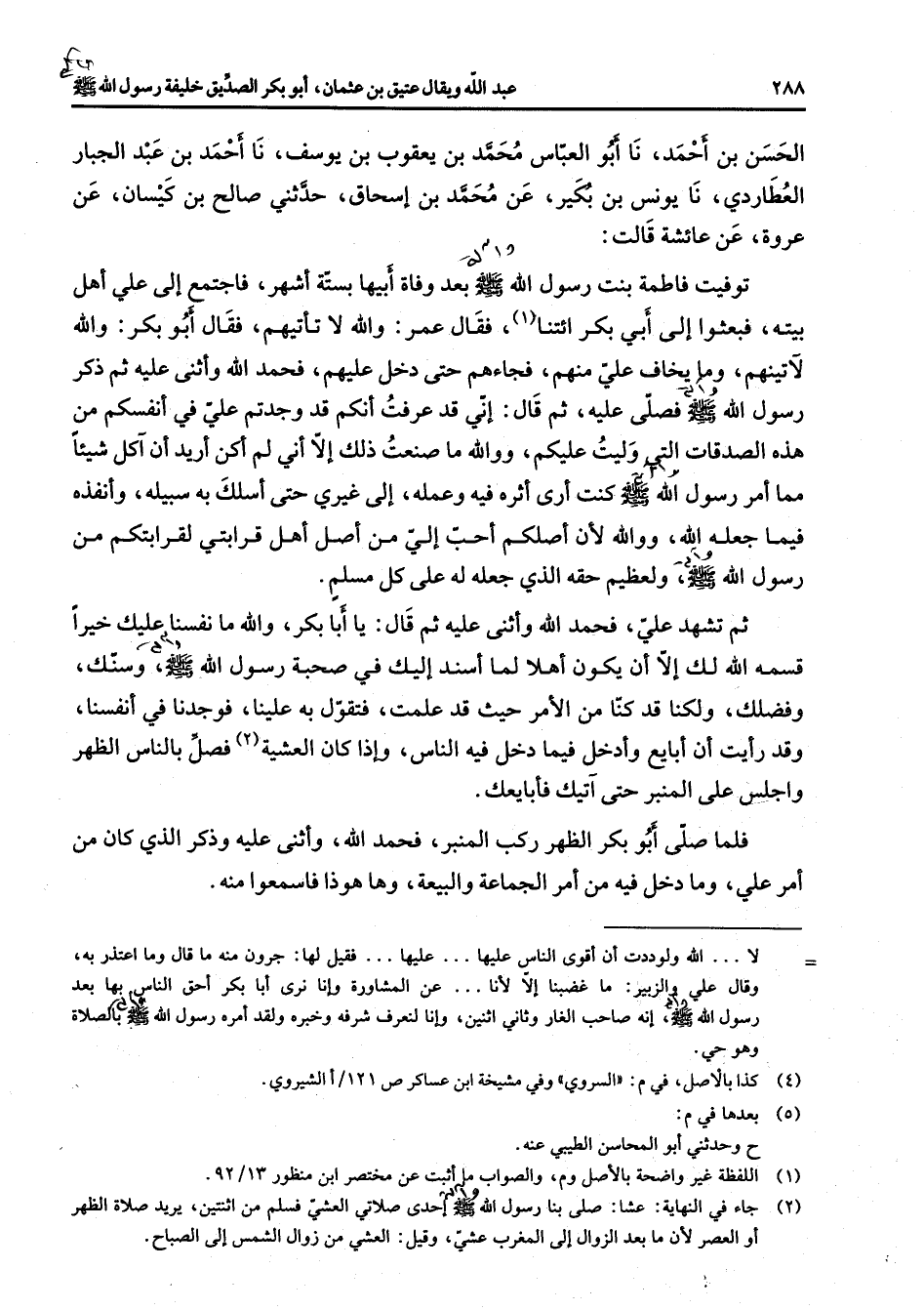 الحسن بن أحمد نا أبو العباس محمد بن يعقوب بن يوسف نا أحمد بن عبد الجبار العطاردي نا يونس بن بكير عن محمد بن إسحاق حدثني صالح بن كيسان عن عروة عن عائشة قالت توفيت فاطمة بنت رسول الله (صلى الله عليه وسلم) بعد وفاة أبيها بستة أشهر فاجتمع إلى علي أهل بيته فبعثوا إلى أبي بكر ائتنا (1) فقال عمر والله لا تأتيهم فقال أبو بكر والله لآتينهم وما يخاف علي منهم فجاءهم حتى دخل عليهم فحمد الله وأثنى عليه ثم ذكر رسول الله (صلى الله عليه وسلم) فصلى عليه ثم قال إني قد عرفت أنكم قد وجدتم علي في أنفسكم من هذه الصدقات التي وليت عليكم ووالله ما صنعت ذلك إلا أني لم أكن أريد أن آكل شيئا مما أمر رسول الله (صلى الله عليه وسلم) كنت أرى أثره فيه وعمله إلى غيري حتى أسلك به سبيله وأنفذه فيما جعله الله ووالله لأن أصلكم أحب إلي من أصل أهل قرابتي لقرابتكم من رسول الله (صلى الله عليه وسلم) ولعظيم حقه الذي جعله له على كل مسلم ثم تشهد علي فحمد الله وأثنى عليه ثم قال يا أبا بكر والله ما نفسنا عليك خيرا قسمه الله لك إلا أن يكون أهلا لما أسند إليك في صحبة رسول الله (صلى الله عليه وسلم) وسنك وفضلك ولكنا قد كنا من الأمر حيث قد علمت فتقول به علينا فوجدنا في أنفسنا وقد رأيت أن أبايع وأدخل فيما دخل فيه الناس وإذا كان العشية (2) فصل بالناس الظهر واجلس على المنبر حتى آتيك فأبايعك فلما صلى أبو بكر الظهر ركب المنبر فحمد الله وأثنى عليه وذكر الذي كان من أمر علي وما دخل فيه من أمر الجماعة والبيعة وها هو ذا فاسمعوا منه