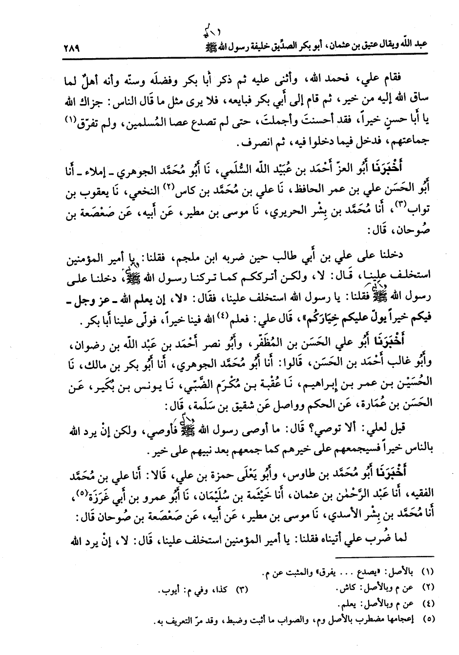 فقام علي فحمد الله واثنى عليه ثم ذكر أبا بكر وفضله وسنه وأنه أهل لما ساق الله إليه من خير ثم قام إلى أبي بكر فبايعه فلا يرى مثل ما قال الناس جزاك الله يا أبا حسن خيرا فقد أحسنت واجملت حتى لم تصدع عصا المسلمين ولم تفرق (1) جماعتهم فدخل فيما دخلوا فيه ثم انصرف أخبرنا أبو العز أحمد بن عبيد الله السلمي نا أبو محمد الجوهري إملاء أنا أبو الحسن علي بن عمر الحافظ نا علي بن محمد بن كاس (2) النخعي نا يعقوب بن تواب (3) أنا محمد بن بشر الحريري نا موسى بن مطير عن أبيه عن صعصعة بن صوحان قال دخلنا على علي بن أبي طالب حين ضربه ابن ملجم فقلنا يا أمير المؤمنين استخلف علينا قال لا ولكن أترككم كما تركنا رسول الله (صلى الله عليه وسلم) دخلنا على رسول الله (صلى الله عليه وسلم) فقلنا يا رسول الله استخلف علينا فقال لا إن يعلم الله عز وجل فيكم خيرا يول عليكم خياركم قال علي فعلم (4) الله فينا خيرا فولى علينا أبا بكر أخبرنا أبو علي الحسن بن المظفر وأبو نصر أحمد بن عبد الله بن رضوان وأبو غالب أحمد بن الحسن قالوا أنا أبو محمد الجوهري انا أبو بكر بن مالك نا الحسين بن عمر بن إبراهيم نا عقبة بن مكرم الضبي نا يونس بن بكير عن الحسن بن عمارة عن الحكم وواصل عن شقيق بن سلمة قال قيل لعلي ألا توصي قال ما أوصى رسول الله (صلى الله عليه وسلم) فأوصي ولكن إن يرد الله بالناس خيرا فسيجمعهم على خيرهم كما جمعهم بعد نبيهم على خير اخبرنا أبو محمد بن طاوس وأبو يعلى حمزة بن علي قالا انا علي بن محمد الفقيه أنا عبد الرحمن بن عثمان أنا خيثمة بن سليمان نا أبو عمرو بن أبي غرزة (5) أنا محمد بن بشر الأسدي نا موسى بن مطير عن أبيه عن صعصعة بن صوحان قال لما ضرب علي أتيناه فقلنا يا أمير المؤمنين استخلف علينا قال لا إن يرد الله