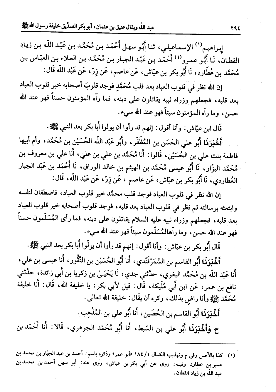 إبراهيم (1) الإسماعيلي ثنا أبو سهل أحمد بن محمد بن عبد الله بن زياد القطان نا أبو عمرو (1) أحمد بن عبد الجبار بن محمد بن العلاء بن العباس بن محمد بن عطارد نا أبو بكر بن عياش عن عاصم عن زر عن عبد الله قال إن الله نظر في قلوب العباد بعد قلب محمد فوجد قلوب أصحابه خير قلوب العباد بعد قلبه فجعلهم وزراء نبيه يقاتلون على دينه فما رآه المؤمنون حسنا فهو عند الله حسن وما رآه المؤمنون سيئا فهو عند الله شئ قال ابن عياش وأنا أقول إنهم قد رأوا أن يولوا أبا بكر بعد النبي (صلى الله عليه وسلم) أخبرنا أبو علي الحسن بن المظفر وأبو عبد الله الحسين بن محمد وأم أبيها فاطمة بنت علي بن الحسين قالوا أنا محمد بن علي بن علي أنا علي بن معروف بن محمد البزار نا أبو عيسى محمد بن الهيثم بن خالد الوراق نا أحمد بن عبد الجبار العطاردي نا أبو بكر بن عياش عن عاصم عن زر عن عبد الله قال إن الله نظر في قلوب العباد فوجد قلب محمد خير قلوب العباد فاصطفان لنفسه وابتعثه برسالته ثم نظر في قلوب العباد بعد قلوب الصحابة خبر قلوب العباد بعد قلبه فجعلهم وزراء نبيه عليه السلام يقاتلون على دينه فما رأى المسلمون حسنا فهو عند الله حسن وما رآها المسلمون سيئا فهو عند الله شئ قال أبو بكر بن عياش وأنا أقول إنهم قد رأوا أن يولوا أبا بكر بعد النبي (صلى الله عليه وسلم) أخبرنا أبو القاسم بن السمرقندي أنا أبو الحسين بن النقور أنا عيسى بن علي أنا عبد الله بن محمد البغوي حدثني جدي نا يحيى بن زكريا بن أبي زائدة حدثني نافع بن عمر عن ابن أبي مليكة قال قيل لأبي بكر يا خليفة الله قال أنا خليفه محمد (صلى الله عليه وسلم) وأنا راض بذلك وكره أن يقال خليفة الله تعالى أخبرنا أبو القاسم بن الحصين أنا أبو علي بن المذهب ح وأخبرنا أبو علي بن السبط أنا أبو محمد الجوهري قالا أنا أحمد بن