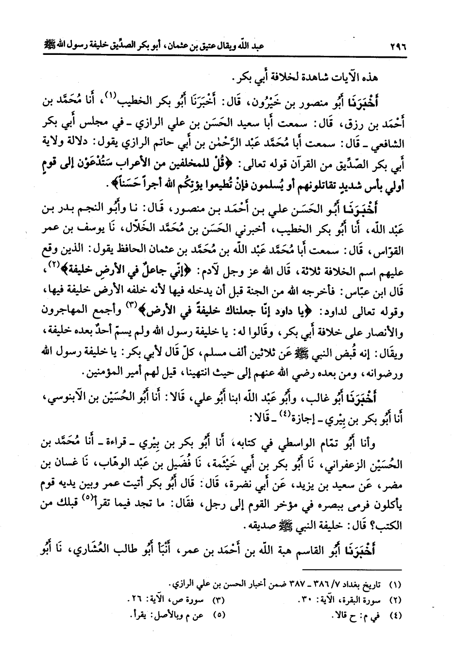 هذه الآيات شاهدة لخلافة أبي بكر أخبرنا أبو منصور بن خيرون قال أخبرنا أبو بكر الخطيب (1) أنا محمد بن أحمد بن رزق قال سمعت أبا سعيد الحسن بن علي الرازي في مجلس أبي بكر الشافعي قال سمعت أبا محمد عبد الرحمن بن أبي حاتم الرازي يقول دلالة ولاية أبي بكر الصديق من القرآن قوله تعالى " قل للمخلفين من الأعراب ستدعون إلى قوم أولي بأس شديد تقاتلونهم أو يسلمون فإن تطيعوا يؤتكم الله أجرا حسنا " أخبرنا أبو الحسن علي بن أحمد بن منصور قال نا وأبو النجم بدر بن عبد الله أنا أبو بكر الخطيب أخبرني الحسن بن محمد الخلال نا يوسف بن عمر القواس قال سمعت أبا محمد عبد الله بن محمد بن عثمان الحافظ يقول الذين وقع عليهم اسم الخلافة ثلاثة قال الله عز وجل لآدم " إني جاعل في الأرض خليفة " (2) خلفه الأرض خليفة فيها وقوله تعالى لداود " يا داود إنا جعلناك خليفة في الأرض " (3) وأجمع المهاجرون والأنصار على خلافة أبي بكر وقالوا له يا خليفة رسول الله ولم يسم أحد بعده خليفة ويقال إنه قبض النبي (صلى الله عليه وسلم) عن ثلاثين ألف مسلم كل قال لأبي بكر يا خليفة رسول الله ورضوانه ومن بعده Bهم إلى حيث انتهينا قيل لهم أمير المؤمنين أخبرنا أبو غالب وأبو عبد الله ابنا أبو علي قالا أنا أبو الحسين بن الآبنوسي أنا أبو بكر بن بيري إجازة (4) قالا وأنا أبو تمام الواسطي في كتابه أنا أبو بكر بن بيري قراءة أنا محمد بن الحسين الزعفراني نا أبو بكر بن أبي خيثمة نا فضيل بن عبد الوهاب نا غسان بن مضر عن سعيد بن يزيد عن أبي نضرة قال قال أبو بكر أتيت عمر وبين يديه قوم يأكلون فرمى ببصره في مؤخر القوم إلى رجل فقال ما تجد فيما تقرأ (5) قبلك من الكتب قال خليفة النبي (صلى الله عليه وسلم) صديقه اخبرنا أبو القاسم هبة الله بن أحمد بن عمر أنبأ أبو طالب العشاري نا أبو