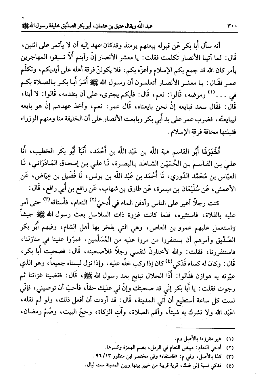 أنه سأل أبا بكر عن قبوله بيعتهم يومئذ وقد كان عهد إليه أن لا يأتمر على اثنين قال لما أتينا الأنصار تكلمت فقلت يا معشر الأنصار إن رأيتم ألا تسبقوا المهاجرين بأمر كان الله قد جمع بكم الإسلام وأعزه بكم فلا يكونن فرقة أهله على أيديكم وتكلم عمر فقال يا معشر الأنصار أتعلمون أن رسول الله (صلى الله عليه وسلم) أمر أبا بكر بالصلاة بكم في (1) ومرضه قالوا نعم فأيكم يجترئ على أن يتقدمه قالوا لا أينا قال فقال سعد فبايعه إن نحن بايعناه قال عمر نعم وأخذ عهدهم إن هو بايعه ليبايعنه فضرب عمر على يد أبي بكر وبايعت الأنصار على أن الخليفة منا ومنهم الوزراء فقبلتها مخافة فرقة الإسلام أخبرنا أبو القاسم هبة الله بن عبد الله بن أحمد أنبأ أبو بكر الخطيب أنا علي بن القاسم بن الحسين الشاهد بالبصرة نا علي بن إسحاق المادرائي نا العباس بن محمد الدوري نا أحمد بن عبد الله بن يونس نا فضيل بن عياض عن الأعمش عن سليمان بن ميسرة عن طارق بن شهاب عن رافع بن أبي رافع قال كنت رجلا أغير على الناس وأدفن الماء في أدحي (2) النعام فأستاقه (3) حتى أمر عليه بالفلاة فاستثيره فلما كانت غزوة ذات السلاسل بعث رسول الله (صلى الله عليه وسلم) جيشا واستعمل عليهم عمرو بن العاص وهي التي يفخر بها أهل الشام وفيهم أبو بكر الصديق وأمرهم أن يستنفروا من مروا عليه من المسلمين فمروا علينا في منازلنا فاستنفرونا فقلت والله لأختارن لنفسي رجلا فلأصحبنه قال فصحبت أبا بكر قال وكان له كساء فدكي (4) كان إذا ركب خله عليه وإذا نزل لبسناه جميعا وهو الذي عيرته به هوازن فقالوا أذا الحلال نبايع بعد رسول الله (صلى الله عليه وسلم) قال فقضينا غزاتنا ثم رجوت فقلت يا أبا بكر إني قد صحبتك وإن لي عليك حقا فأحب أن توصيني فإني لست كل ساعة أستطيع أن آتي المدينة قال قد أردت أن أفعل ذلك ولو لم تقله اعبد الله ولا تشرك به شيئا وأقم الصلاة وآت الزكاة وحج البيت وصم رمضان