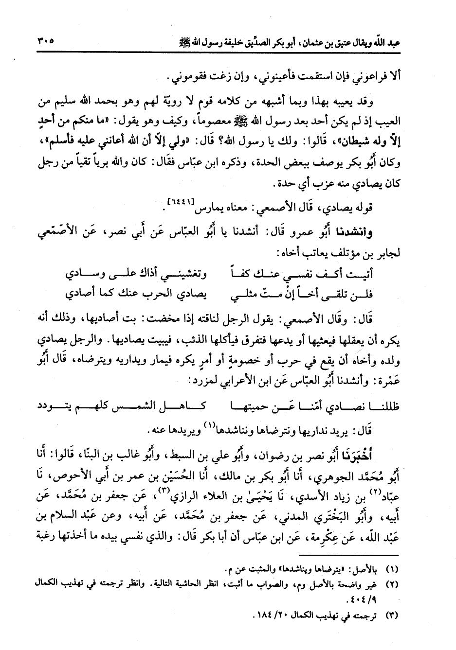 [6441] وأنشدنا أبو عمرو قال أنشدنا يا أبو العباس عن أبي نصر عن الأصمعي لجابر بن مؤتلف يعاتب أخاه * أتيت أكف نفسي عنك كفا * وتغشيني أذاك على وسادي فلن تلقى أخا إن مت مثلي * يصادي الحرب عنك كما أصادي * قال وقال الأصمعي يقول الرجل لناقته إذا مخضت بت أصاديها وذلك أنه يكره أن يعقلها فيعثيها أو يدعها فتفرق فيأكلها الذئب فيبيت يصاديها والرجل يصادي ولده وأخاه أن يقع في حرب أو خصومة أو أمر يكره فيمار ويداريه ويترضاه قال أبو عمرة وأنشدنا أبو العباس عن ابن الأعرابي لمزرد * ظللنا نصادي أمنا عن حميتها * كاهل الشمس كلهم يتودد * قال يريد نداريها ونترضاها ونناشدها (1) ويريدها عنه أخبرنا أبو نصر بن رضوان وأبو علي بن السبط وأبو غالب بن البنا قالوا أنا أبو محمد الجوهري أنا أبو بكر بن مالك أنا الحسين بن عمر بن أبي الأحوص نا عباد (2) بن زياد الأسدي نا يحيى بن العلاء الرازي (3) عن جعفر بن محمد عن أبيه وأبو البختري المدني عن جعفر بن محمد عن أبيه وعن عبد السلام بن عبد الله عن عكرمة عن ابن عباس أن أبا بكر قال والذي نفسي بيده ما أخذتها رغبة