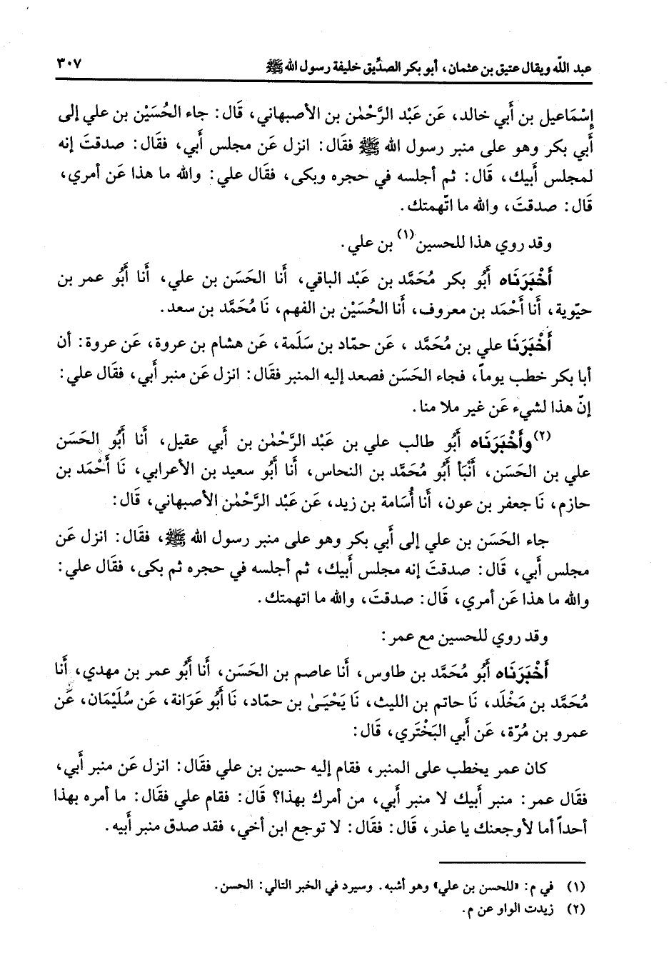 إسماعيل بن أبي خالد عن عبد الرحمن بن الأصبهاني قال جاء الحسين بن علي إلى أبي بكر وهو على منبر رسول الله (صلى الله عليه وسلم) فقال انزل عن مجلس أبي فقال صدقت إنه لمجلس أبيك قال ثم أجلسه في حجره وبكى فقال علي والله ما هذا عن أمري قال صدقت والله ما اتهمتك وقد روي هذا للحسين (1) بن علي أخبرناه أبو بكر محمد بن عبد الباقي أنا الحسن بن علي أنا أبو عمر بن حيوية أنا أحمد بن معروف أنا الحسين بن الفهم نا محمد بن سعد أخبرنا علي بن محمد عن حماد بن سلمة عن هشام بن عروة عن عروة أن أبا بكر خطب يوما فجاء الحسن فصعد إليه المنبر فقال انزل عن منبر أبي فقال علي إن هذا لشئ عن غير ملامنا (2) واخبرناه أبو طالب علي بن عبد الرحمن بن أبي عقيل أنا أبو الحسن علي بن الحسن أنبأ أبو محمد بن النحاس انا أبو سعيد بن الأعرابي نا أحمد بن حازم نا جعفر بن عون أنا أسامة بن زيد عن عبد الرحمن الأصبهاني قال جاء الحسن بن علي إلى أبي بكر وهو على منبر رسول الله (صلى الله عليه وسلم) فقال انزل عن مجلس أبي قال صدقت إنه مجلس أبيك ثم أجلسه في حجره ثم بكى فقال علي والله ما هذا عن أمري قال صدقت والله ما اتهمتك وقد روي للحسين مع عمر أخبرناه أبو محمد بن طاوس أنا عاصم بن الحسن أنا أبو عمر بن مهدي أنا محمد بن مخلد نا حاتم بن الليث نا يحيى بن حماد نا أبو عوانة عن سليمان عن عمرو بن مرة عن أبي البختري قال كان عمر يخطب على المنبر فقام إليه حسين بن علي فقال انزل عن منبر أبي فقال عمر منبر أبيك لا منبر أبي من أمرك بهذا قال فقام علي فقال ما أمره بهذا أحدا أما لأوجعنك يا عذر قال فقال لا توجع ابن أخي فقد صدق منبر أبيه