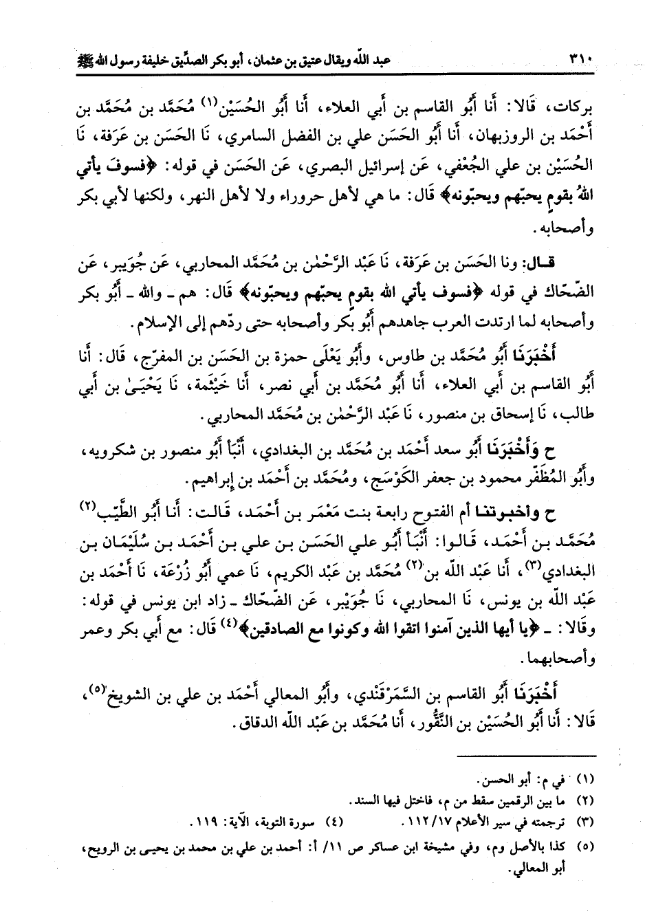 بركات قالا أنا أبو القاسم بن أبي العلاء أنا أبو الحسين (1) محمد بن محمد بن أحمد بن الروزبهان أنا أبو الحسن علي بن الفضل السامري نا الحسن بن عرفة نا الحسين بن علي الجعفي عن إسرائيل البصري عن الحسن في قوله " فسوف يأتي الله بقوم يحبهم ويحبونه " قال ما هي لأهل حروراء ولا لأهل النهر ولكنها لأبي بكر وأصحابه قال ونا الحسن بن عرفة نا عبد الرحمن بن محمد المحاربي عن جويبر عن الضحاك في قوله " فسوف يأتي الله بقوم يحبهم ويحبونه " قال هم والله أبو بكر وأصحابه لما ارتدت العرب جاهدهم أبو بكر وأصحابه حتى ردهم إلى الإسلام أخبرنا أبو محمد بن طاوس وأبو يعلى حمزة بن الحسن بن المفرج قال أنا أبو القاسم بن أبي العلاء أنا أبو محمد بن أبي نصر أنا خيثمة نا يحيى بن أبي طالب نا إسحاق بن منصور نا عبد الرحمن بن محمد المحاربي ح وأخبرنا أبو سعد أحمد بن محمد بن البغدادي أنبأ أبو منصور بن شكرويه وأبو المظفر محمود بن جعفر الكوسج ومحمد بن أحمد بن إبراهيم ح وأخبرتنا أم الفتوح رابعة بنت معمر بن أحمد قالت أنا أبو الطيب (2) محمد بن أحمد قالوا أنبأ أبو علي الحسن بن علي بن أحمد بن سليمان بن البغدادي (3) أنا عبد الله بن (2) محمد بن عبد الكريم نا عمي أبو زرعة نا أحمد بن عبد الله بن يونس نا المحاربي نا جويبر عن الضحاك زاد ابن يونس في قوله وقالا " يا أيها الذين آمنوا اتقوا الله وكونوا مع الصادقين " (4) قال مع أبي بكر وعمر وأصحابهما أخبرنا أبو القاسم بن السمرقندي وأبو المعالي أحمد بن علي بن الشويخ (5) قالا أنا أبو الحسين بن النقور أنا محمد بن عبد الله الدقاق