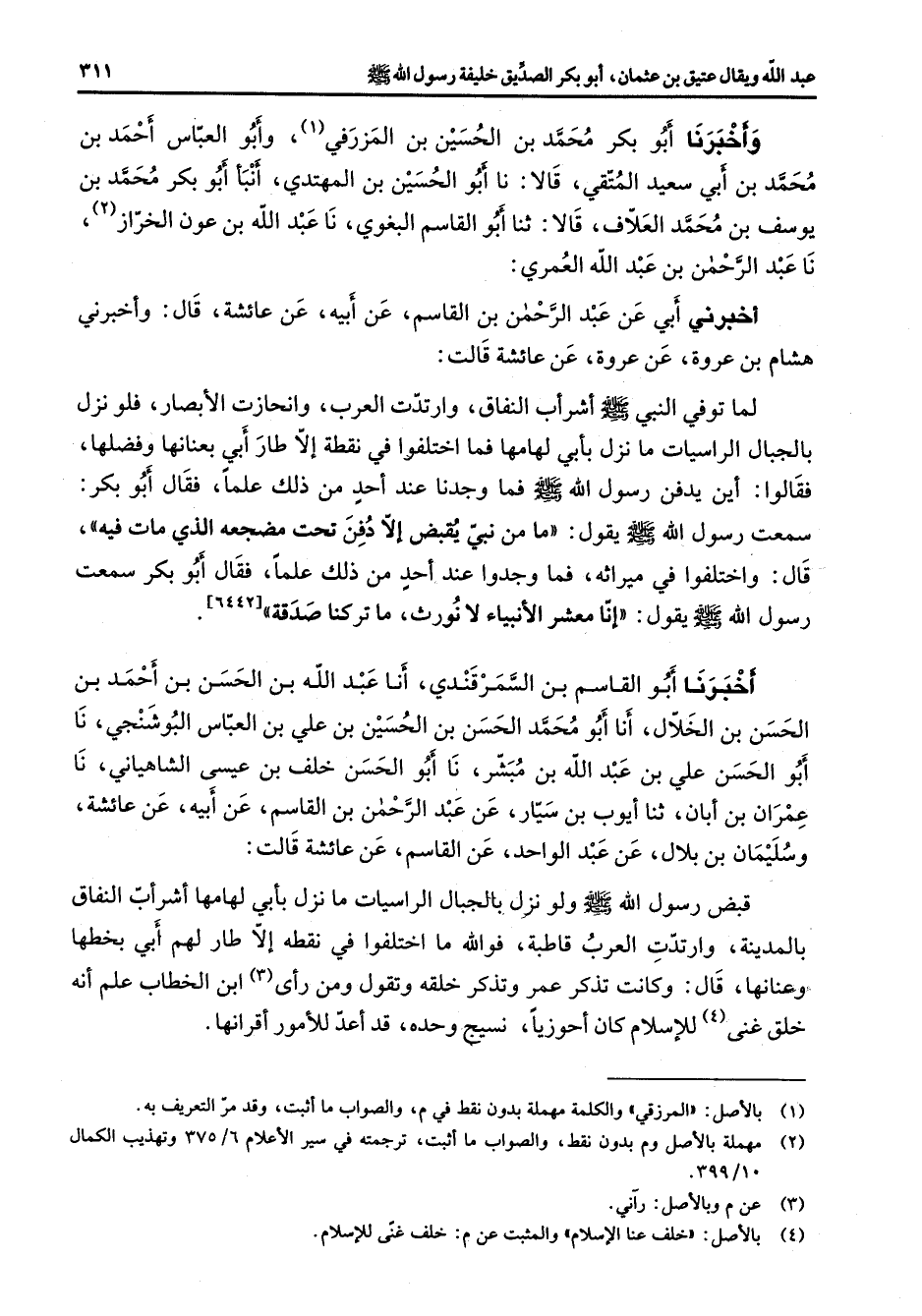 وأخبرنا أبو بكر محمد بن الحسين بن المزرفي (1) وأبو العباس أحمد بن محمد بن أبي سعيد المتقي قالا نا أبو الحسين بن المهتدي أنبأ أبو بكر محمد بن يوسف بن محمد العلاف قالا ثنا أبو القاسم البغوي نا عبد الله بن عون الخراز (2) نا عبد الرحمن بن عبد الله العمري أخبرني أبي عن عبد الرحمن بن القاسم عن أبيه عن عائشة قال وأخبرني هشام بن عروة عن عروة عن عائشة قالت لما توفي النبي (صلى الله عليه وسلم) أشرأب النفاق وارتدت العرب وانحازت الأبصار فلو نزل بالجبال الراسيات ما نزل بأبي لهامها فما اختلفوا في نقطة إلا طار أبي بعنانها وفضلها فقالوا أين يدفن رسول الله (صلى الله عليه وسلم) فما وجدنا عند أحد من ذلك علما فقال أبو بكر سمعت رسول الله (صلى الله عليه وسلم) يقول ما من نبي يقبض إلا دفن تحت مضجعه الذي مات فيه قال واختلفوا في ميراثه فما وجدوا عند أحد من ذلك علما فقال أبو بكر سمعت رسول الله (صلى الله عليه وسلم) يقول إنا معشر الأنبياء لا نورث ما تركنا صدقة