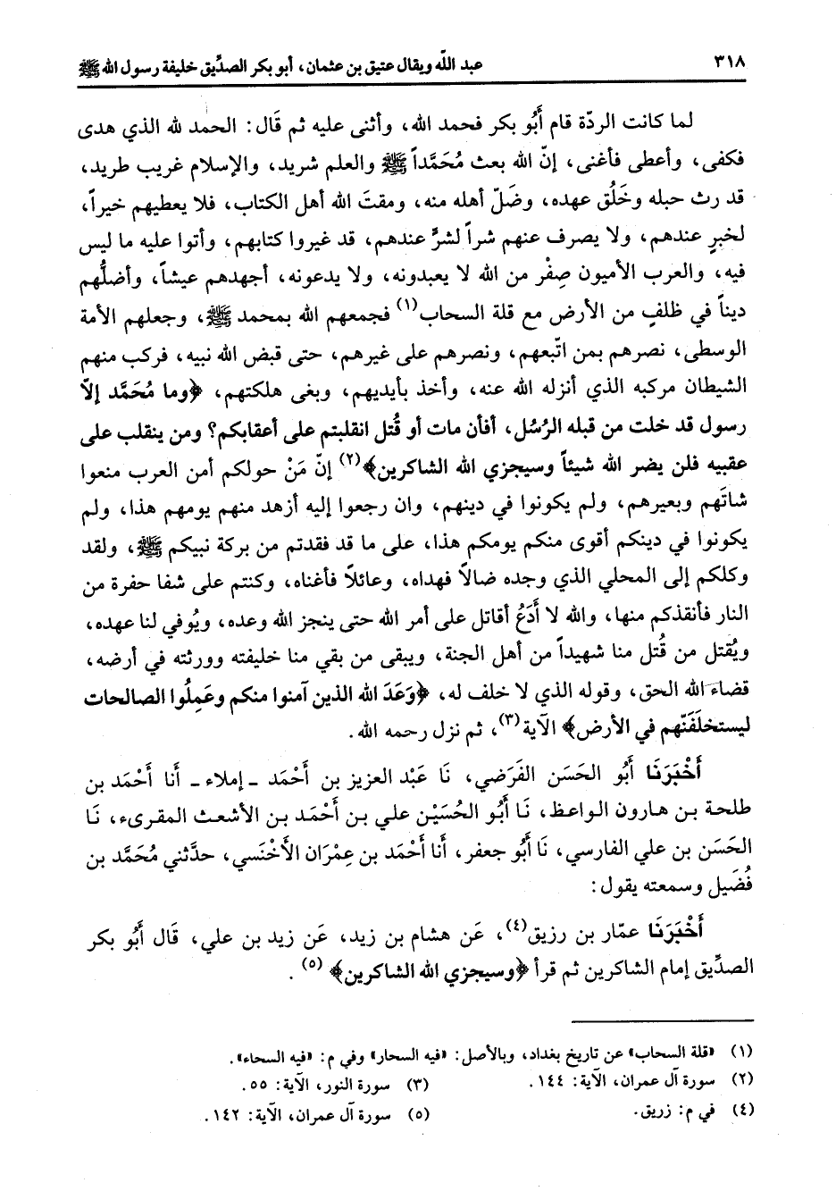 لما كانت الردة قام أبو بكر فحمد الله وأثنى عليه ثم قال الحمد لله الذي هدى فكفى وأعطى فأغنى إن الله بعث محمدا (صلى الله عليه وسلم) والعلم شريد والإسلام غريب طريد قد رث حبله وخلق عهده وضل أهله منه ومقت الله أهل الكتاب فلا يعطيهم خيرا لخبر عندهم ولا يصرف عنهم شرا لشر عندهم قد غيروا كتابهم وأتوا عليه ما ليس فيه والعرب الأميون صفر من الله لا يعبدونه ولا يدعونه أجهدهم عيشا وأضلهم دينا في ظلف من الأرض مع قلة السحاب (1) فجمعهم الله بمحمد (صلى الله عليه وسلم) وجعلهم الأمة الوسطى نصرهم بمن اتبعهم ونصرهم على غيرهم حتى قبض الله نبيه فركب منهم الشيطان مركبه الذي أنزله الله عنه وأخذ بأيديهم وبغى هلكتهم " وما محمد إلا رسول قد خلت من قبله الرسل أفإن مات أو قتل انقلبتم على أعقابكم ومن ينقلت على عقبيه فلن يضر الله شيئا وسيجزي الله الشاكرين " (2) إن من حولكم أمن العرب منعوا شاتهم وبعيرهم ولم يكونوا في دينهم وإن رجعوا إليه أزهد منهم يومهم هذا ولم يكونوا في دينكم أقوى منكم يومكم هذا على ما قد فقدتم من بركة نبيكم (صلى الله عليه وسلم) ولقد وكلكم إلى المحلي الذي وجده ضالا فهداه وعائلا فأغناه وكنتم على شفا حفرة من النار فأنقذكم منها والله لا أدع أقاتل على أمر الله حتى ينجز الله وعده ويوفي لنا عهده ويقتل من قتل منا شهيدا من أهل الجنة ويبقى من بقي منا خليفته وورثته في أرضه قضاء الله الحق وقوله الذي لا خلف له " وعد الله الذين آمنوا منكم وعملوا الصالحات ليستخلفنهم في الأرض " الآية (3) ثم نزل رحمة الله أخبرنا أبو الحسن الفرضي نا عبد العزيز بن أحمد إملاء أنا أحمد بن طلحة بن هارون الواعظ نا أبو الحسين علي بن أحمد بن الأشعث المقرئ نا الحسن بن علي الفارسي نا أبو جعفر أنا أحمد بن عمران الأخنسي حدثني محمد بن فضيل وسمعته يقول أخبرنا عمار بن رزيق (4) عن هشام بن زيد عن زيد بن علي قال أبو بكر الصديق إمام الشاكرين ثم قرأ " وسيجزي الله الشاكرين " (5)