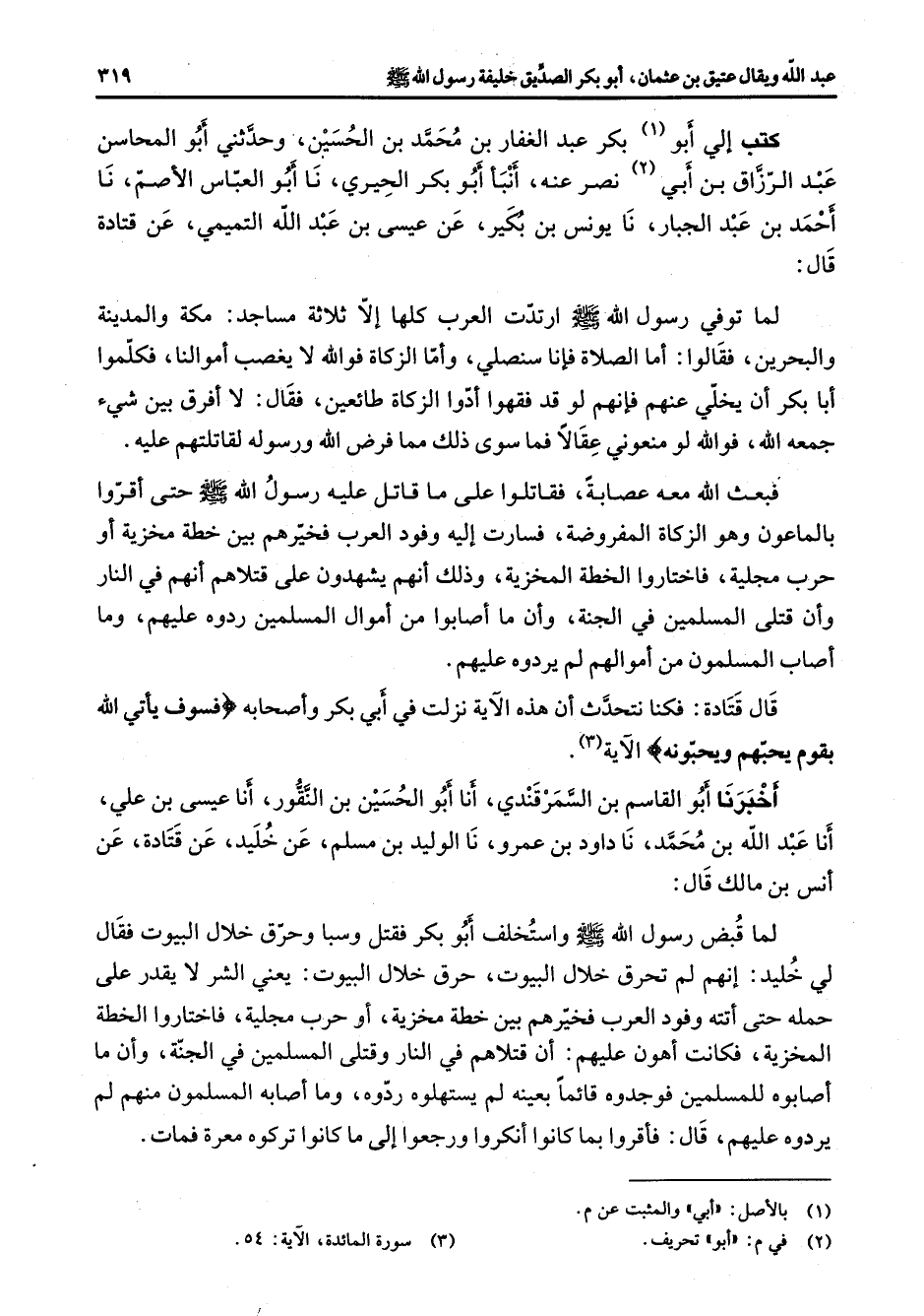 كتب إلي أبو (1) بكر عبد الغفار بن محمد بن الحسين وحدثني أبو المحاسن عبد الرزاق بن أبي (2) نصر عنه أنبأ أبو بكر الحيري نا أبو العباس الأصم نا أحمد بن عبد الجبار نا يونس بن بكير عن عيسى بن عبد الله التميمي عن قتادة قال لما توفي رسول الله (صلى الله عليه وسلم) ارتدت العرب كلها إلا ثلاثة مساجد مكة والمدينة والبحرين فقالوا أما الصلاة فإنا سنصلي وأما الزكاة فوالله لا يعصب أموالنا فكلموا أبا بكر أن يخلي عنهم فإنهم لو قد فقهوا أدوا الزكاة طائعين فقال لا أفرق بين شئ جمعه الله فوالله لو منعوني عقالا فما سوى ذلك مما فرض الله ورسوله لقاتلتهم عليه فبعث الله معه عصابة فقاتلوا على ما قاتل عليه رسول الله (صلى الله عليه وسلم) حتى أقروا بالماعون وهو الزكاة المفروضة فسارت إليه وفود العرب فخيرهم بين خطة مخزية أو حرب مجلية فاختاروا الخطة المخزية وذلك أنهم يشهدون على قتلاهم أنهم في النار وأن قتلى المسلمين في الجنة وأن ما أصابوا من أموال المسلمين ردوه عليهم وما أصاب المسلمون من أموالهم لم يردوه عليهم قال قتادة فكنا نتحدث أن هذه الآية نزلت في أبي بكر وأصحابه " فسوف يأتي الله بقوم يحبهم ويحبونه " الآية (3) أخبرنا أبو القاسم بن السمرقندي أنا أبو الحسين بن النقور أنا عيسى بن علي أنا عبد الله بن محمد نا داود بن عمرو نا الوليد بن مسلم عن خليد عن قتادة عن أنس بن مالك قال لما قبض رسول الله (صلى الله عليه وسلم) واستخلف أبو بكر فقتل وسبا وحرق خلال البيوت فقال لي خليد إنهم لم تحرق خلال البيوت حرق خلال البيوت يعني الشر لا يقدر على حمله حتى أتته وفود العرب فخيرهم بين خطة مخزية أو حرب مجلية فاختاروا الخطة المخزية فكانت أهون عليهم أن قتلاهم في النار وقتلى المسلمين في الجنة وأن ما أصابوه للمسلمين فوجدوه قائما بعينه لم يستهلوه ردوه وما أصابه المسلمون منهم لم يردوه عليهم قال فأقروا بما كانوا وأنكروا ورجعوا إلى ما كانوا تركوه معرة فمات