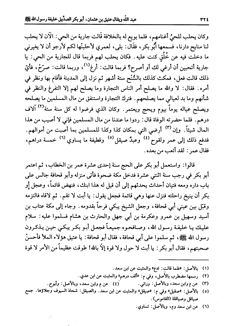 وكان يحلب للحي أغنامهم فلما بويع له بالخلافة قالت جارية من الحي الآن لا يحلب لنا منايح دارنا فسمعها أبو بكر فقال بلى لعمري لأحلبنها لكم لأرجو أن لا يغيرني ما دخلت فيه عن خلق كنت عليه فكان يحلب لهم فربما قال للجارية من الحي يا جارية أتحبين أن أرغي لك أو أصرح فربما قالت أرغ (1) وربما قالت صرح فأي ذلك قالت فعل فمكث كذلك بالسنح ستة أشهر ثم نزل إلى المدينة فأقام بها ونظر في أمره فقال لا والله ما يصلح أمر الناس التجارة وما يصلح لهم إلا التفرغ والنظر في شأنهم وما بد لعيالي مما يصلحهم فترك التجارة واستنفق من مال المسلمين ما يصلحه ويصلح عياله يوما بيوم ويحج ويعتمر وكان الذي فرضوا له كل سنة ستة (2) آلاف درهم فلما حضرته الوفاة قال ردوا ما عندنا من مال المسلمين فإني لا أصيب من هذا المال شيئا وإن (3) أرضي التي بمكان كذا وكذا للمسلمين بما أصبت من أموالهم فدفع ذلك إلى عمر ولقوح (4) وعبد صقيل (5) وقطيفة ما يساوي (6) خمسة دراهم فقال عمر لقد أتعب من بعده قالوا واستعمل أبو بكر على الحج سنة إحدى عشرة عمر بن الخطاب ثم اعتمر أبو بكر في رجب سنة اثنتي عشرة فدخل مكة ضحوة فأتى منزله وأبو قحافة جالس على باب داره ومعه فتيان أحداث يحدثهم إلى أن قيل له هذا ابنك فنهض قائما وعجل أو بكر أن ينيخ راحلته فنزل عنها وهي قائمة فجعل يقول يا أبت لا تقم ثم لاقاه فالتزمه وقبل بين عيني أبي قحافة وجعل الشيخ يبكي فرحا بقدومه وجاء إلى مكة عتاب بن أسيد وسهيل بن عمرو وعكرمة بن أبي جهل والحارث بن هشام فسلموا عليه سلام عليك يا خليفة رسول الله وصافحوه جميعا فجعل أبو بكر يبكي حين يذكرون رسول الله (صلى الله عليه وسلم) ثم سلموا على أبي قحافة فقال أبو قحافة يا عتيق هؤلاء الملأ فأحسن صحبتهم فقال أبو بكر يا أبت لا حول ولا قوة إلا بالله طوقت عظيما من الأمر لا قوة