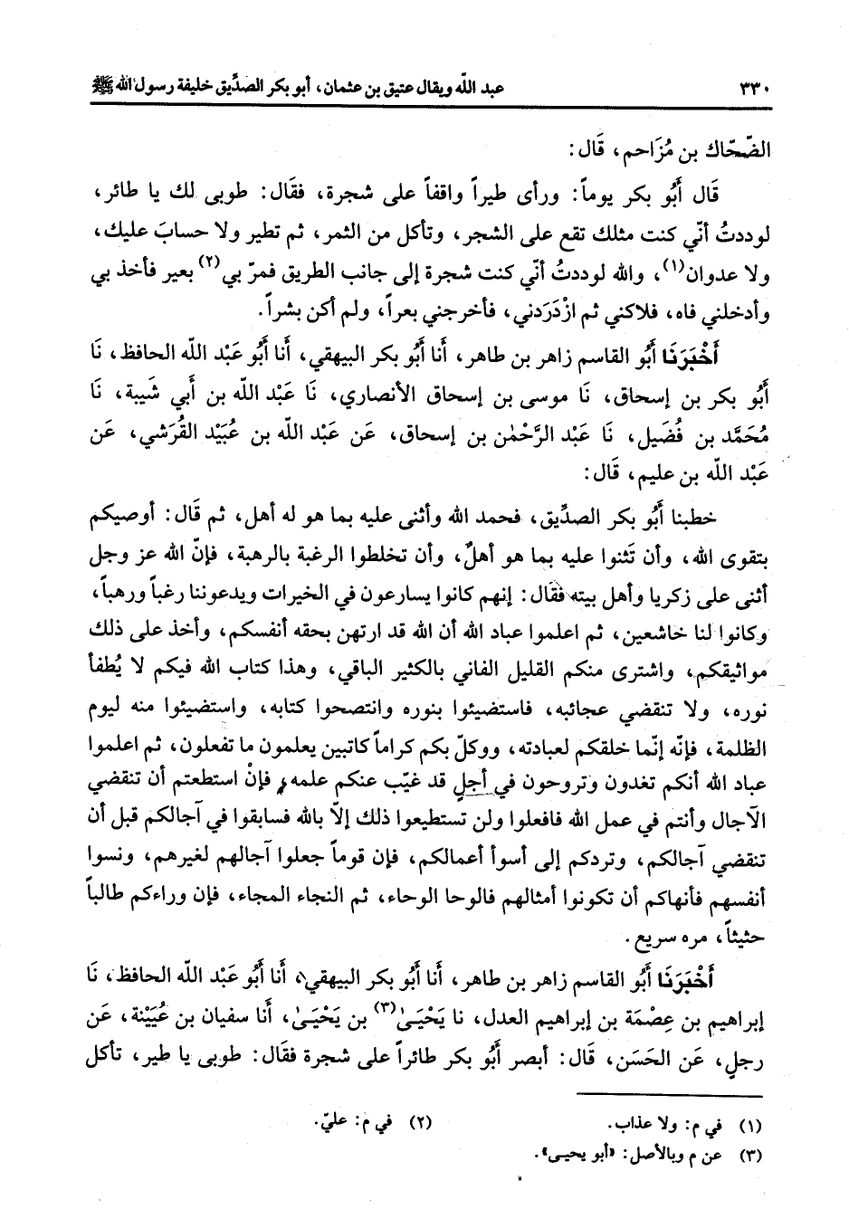 الضحاك بن مزاحم قال قال أبو بكر يوما ورأى طيرا واقفا على شجرة فقال طوبى لك يا طائر لوددت أني كنت مثلك تقع على الشجرة وتأكل من الثمر ثم تطير ولا حساب عليك ولا عدوان (1) والله لوددت أني كنت شجرة إلى جانب الطريق فمر بي (2) بعير فأخذ بي وأدخلني فاه فلاكني ثم ازدردني فأخرجني بعرا ولم أكن بشرا أخبرنا أبو القاسم زاهر بن طاهر أنا أبو بكر البيهقي أنا أبو عبد الله الحافظ نا أبو بكر بن إسحاق نا موسى بن إسحاق الأنصاري نا عبد الله بن أبي شيبة نا محمد بن فضيل نا عبد الرحمن بن إسحاق عن عبد الله بن عبيد القرشي عن عبد الله بن عليم قال خطبنا أبو بكر الصديق فحمد الله وأثنى عليه بما هو له أهل ثم قال أوصيكم بتقوى الله وأن تثنوا عليه بما هو أهل وأن تخلطوا الرغبة بالرهبة فإن الله عز وجل أثنى على زكريا وأهل بيته فقال إنهم كانوا يسارعون في الخيرات ويدعوننا رغبا ورهبا وكانوا لنا خاشعين ثم اعلموا عباد الله أن الله قد ارتهن بحقه أنفسكم وأخذ على ذلك مواثيقكم واشترى منكم القليل الفاني بالكثير الباقي وهذا كتاب الله فيكم لا يطفأ نوره ولا تنقضي عجائبه فاستضيئوا بنوره وانتصحوا كتابه واستضيئوا منه ليوم الظلمة فإنه إنما خلقكم لعبادته ووكل بكم كراما كاتبين يعلمون ما تفعلون ثم اعلموا عباد الله أنكم تغدون وتروحون في أجل قد غيب عنكم علمه فإن استطعتم أن تنقضي الآجال وأنتم في عمل الله فافعلوا ولن تستطيعوا ذلك إلا بالله فسابقوا في آجالكم قبل أن تنقضي لآجالكم وتردكم إلى أسوأ أعمالكم فإن قوما جعلوا آجالهم لغيرهم ونسوا أنفسهم فأنهاكم أن تكونوا أمثالهم فالوحا الوحاء ثم النجاء المجاء فإن ورائكم طالبا حثيثا مره سريع أخبرنا أبو القاسم زاهر بن طاهر أنا أبو بكر البيهقي أنا أبو عبد الله الحافظ نا إبراهيم بن عصمة بن إبراهيم العدل نا يحيى (3) بن يحيى أنا سفيان بن عيينة عن رجل عن الحسن قال أبصر أبو بكر طائرا على الشجرة فقال طوبى يا طير تأكل