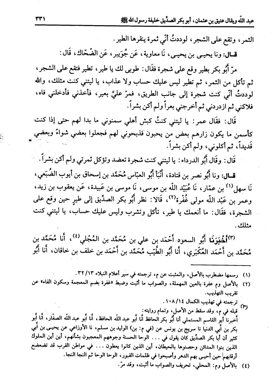 الثمر وتقع على الشجر لوددت أني ثمرة ينقرها الطير قال ونا يحيى بن يحيى نا معاوية عن جويبر عن الضحاك قال مر أبو بكر بطير وقع على شجرة فقال طوبى لك يا طير تطير فتقع على الشجر ثم تأكل من الثمر ثم تطير ليس عليك حساب ولا عذاب يا ليتني كنت مثلك والله لوددت أني كنت شجرة إلى جانب الطريق فمر علي بعير فأخذني فأدخلني فاه فلاكني ثم ازدردني ثم أخرجني بعرا ولم أكن بشرا قال فقال عمر يا ليتني كنت كبش أهلي سمنوني ما بدا لهم حتى إذا كنت كأسمن ما يكون زارهم بعض من يحبون فذبحوني لهم فجعلوا بعضي شواء وبعضي قديدا ثم أكلوني ولم أكن بشرا قال وقال أبو الدرداء يا ليتني كنت شجرة تعضد وتأكل ثمرتي ولم أكن بشرا قال ونا أبو نصر بن قتادة أنبأ أبو العباس محمد بن إسحاق بن أيوب الضبعي نا سهل (1) بن عمار نا عبيد الله بن موسى نا موسى بن عبيدة عن يعقوب بن زيد وعمر بن عبد الله مولى غفرة (2) قالا نظر أبو بكر الصديق إلى طير حين وقع على الشجرة فقال ما أنعمك يا طير تأكل وتشرب وليس عليك حساب يا ليتني كنت مثلك (3) أخبرنا أبو السعود أحمد بن علي بن محمد المجلي (4) أنا محمد بن محمد بن أحمد العكبري أنا أبو الطيب محمد بن أحمد بن خلف بن خاقان أنا أبو