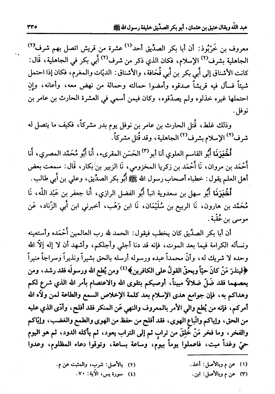 معروف بن خربوذ أن أبا بكر الصديق أحد (1) عشرة من قريش اتصل بهم شرف (2) الجاهلية بشرف (2) الإسلام فكان الذي ذكر من شرف (2) أبي بكر في الجاهلية قال كانت الأشناق إلى أبي بكر بن أبي قحافة والأشناق الديات والمغرم فكان إذا احتمل شيئا فسأل فيه قريشا صدقوه وأمضوا حمالته وحمالة من نهض معه وأعانه وإن احتملها غيره خذلوه ولم يصدقوه وكان فيمن أسمي في العشرة الحارث بن عامر بن نوفل وذلك غلط قتل الحارث بن عامر بن نوفل يوم بدر مشركا فكيف ما يتصل له شرف (2) الإسلام بشرف (2) الجاهلية وقد قتل مشركا أخبرنا أبو القاسم العلوي أنا أبو (3) الحسن المقرئ أنا أبو محمد المصري أنا أحمد بن مروان نا أحمد بن زكريا المخزومي نا الزبير بن بكار قال سمعت بعض أهل العلم يقول خطباء أصحاب رسول الله (صلى الله عليه وسلم) أبو بكر الصديق وعلي بن أبي طالب أخبرنا أبو سهل بن سعدوية أنبأ أبو الفضل الرازي أنا جعفر بن عبد الله نا محمد بن هارون نا الربيع بن سليمان نا ابن وهب أخبرني ابن أبي الزناد عن موسى بن عقبة أن أبا بكر الصديق كان يخطب فيقول الحمد لله رب العالمين أحمده وأستعينه ونسأله الكرامة فيما بعد الموت فإنه قد دنا أجلي وأجلكم وأشهد أن لا إله إلا الله وحده لا شريك له وأن محمدا عبده ورسوله أرسله بالحق بشيرا ونذيرا وسراجا منيرا " لينذر من كان حيا ويحق القول على الكافرين " (4) ومن يطع الله ورسوله فقد رشد ومن يعصهما فقد ضل ضلالا مبينا أوصيكم بتقوى الله والاعتصام بأمر الله الذي شرع لكم وهداكم به فإن جوامع هدى الإسلام بعد كلمة الإخلاص السمع والطاعة لمن ولاه الله أمركم فإنه من يطع والي الأمر بالمعروف والنهي عن المنكر فقد أفلح وأدى الذي عليه من الحق وإياكم واتباع الهوى فقد أفلح من حفظ من الهوى والطمع والغضب وإياكم والفخر وما فخر من خلق من تراب ثم إلى التراب يعود ثم يأكله الدود ثم هو اليوم حي وغدا ميت فاعملوا يوما بيوم وساعة بساعة وتوقوا دعاء المظلوم وعدوا