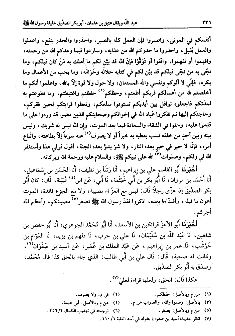 أنفسكم في الموتى واصبروا فإن العمل كله بالصبر واحذروا والحذر ينفع واعملوا والعمل يقبل واحذروا ما حذركم الله من عذابه وسارعوا فيما وعدكم الله من رحمته وافهموا أو تفهموا واتقوا أو توقوا فإن الله قد بين لكم ما أهلك به من كان قبلكم وما نجى به من نجى قبلكم قد بين لكم في كتابه حلاله وحرامه وما يحب من الأعمال وما يكره فإني لا ألوكم ونفسي والله المستعان ولا حول ولا قوة إلا بالله واعلموا أنكم ما أخلصتم لله من أعمالكم فربكم أطعتم وحظكم (1) حفظتم واغتبطتم وما تطوعتم به لمدتكم فاجعلوه نوافل بين أيديكم تستوفوا سلعكم وتعطوا قرابتكم لحين فقركم وحاجتكم إليها ثم تفكروا عباد الله في إخوانكم وصحابتكم الذين مضوا قد وردوا على ما قدموا عليه وحلوا في الشقاء والسعادة فيما بعد الموت وإن الله ليس له شريك وليس بينه وبين أحد من خلقه نسب يعطيه به خيرا أو لا يصرف (2) عنه سوءا إلا بطاعته واتباع امره فإنه لا خير في خير بعده النار ولا شر بشر بعده الجنة أقول قولي هذا وأستغفر الله لي ولكم وصلوات (3) الله على نبيكم (صلى الله عليه وسلم) والسلام عليه ورحمة الله وبركاته أخبرنا أبو القاسم علي بن إبراهيم أنا رشأ بن نظيف أنا الحسن بن إسماعيل أنا أحمد بن مروان نا أبو بكر بن أبي خيثمة نا أبي عن ابن (4) عيينة قال كان أبو بكر الصديق إذا عزى رجلا قال ليس مع العزاء مصيبة ولا مع الجزع فائدة الموت أهون ما قبله وأشد ما بعده اذكروا فقد رسول الله (صلى الله عليه وسلم) تصغر (5) مصيبتكم وأعظم الله أجركم أخبرنا أبو الأعز قراتكين بن الأسعد أنا أبو محمد الجوهري أنا أبو حفص بن شاهين نا عبد الله بن سليمان نا علي بن حرب نا دلهم بن يزيد نا العوام بن حوشب نا عمر بن إبراهيم عن عبد الملك بن عمير عن أسيد بن صفوان (6) وكانت له صحبة قال قال علي بن أبي طالب الذي جاء بالحق كذا قال محمد وصدق به أبو بكر الصديق هكذا قال الحق ولعلها قراءة لعلي (7)