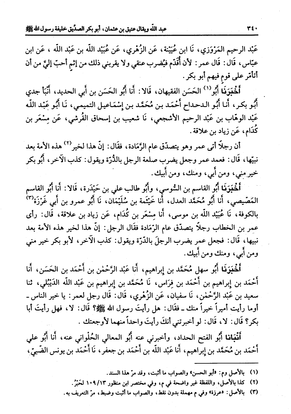 عبد الرحيم المروزي نا ابن عيينة عن الزهري عن عبيد الله بن عبد الله عن ابن عباس قال قال عمر لأن أقدم فيضرب عنقي ولا يقربني ذلك من إثم أحب إلي من أن أتأمر على قوم فيهم أبو بكر أخبرنا أبو (1) الحسن الفقيهان قالا أنا أبو الحسن بن أبي الحديد أنبأ جدي أبو بكر أنا أبو الدحداح أحمد بن محمد بن إسماعيل التميمي نا أبو عبد الله عبد الوهاب بن عبد الرحيم الأشجعي نا شعيب بن إسحاق القرشي عن مسعر بن كدام عن زياد بن علاقة أن رجلا أتى عمر وهو يتصدق عام الرمادة فقال إن هذا لخير (2) هذه الأمة بعد نبيها قال فعمد عمر وجعل يضرب صلعة الرجل بالدرة ويقول كذب الآخر أبو بكر خير مني ومن أبي ومنك ومن أبيك أخبرنا أبو القاسم بن السوسي وأبو طالب علي بن حيدرة قالا أنا أبو القاسم المصيصي أنا أبو محمد العدل أنا خيثمة بن سليمان نا أبو عمرو بن أبي غرزة (3) بالكوفة نا عبيد الله بن موسى أنا مسعر بن كدام عن زياد بن علاقة قال رأى عمر بن الخطاب رجلا يتصدق عام الرمادة فقال الرجل إن هذا لخير هذه الأمة بعد نبيها قال فجعل عمر يضرب الرجل بالدرة ويقول كذب الاخر لأبو بكر خير مني ومن أبي ومنك ومن أبيك أخبرنا أبو سهل محمد بن إبراهيم أنا عبد الرحمن بن أحمد بن الحسن أنا أحمد بن إبراهيم بن أحمد بن فراس نا محمد بن إبراهيم بن عبد الله الديبلي ثنا سعيد بن عبد الرحمن نا سفيان عن الزهري قال قال رجل لعمر يا خير الناس أوما رأيت أميرا خيرا منك فقال هل رأيت رسول الله (صلى الله عليه وسلم) قال لا فهل رأيت أبا بكر قال لا قال لو أخبرتني أنك رأيت واحدا منهما لأوجعتك أنبأنا أبو الفتح الحداد وأخبرني عنه أبو المعالي الحلواني عنه أنا أبو علي أحمد بن محمد بن إبراهيم أنا عبد الله بن أحمد بن جعفر نا أحمد بن يونس الضبي